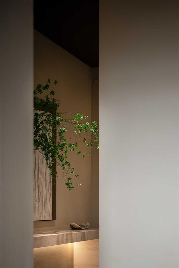 一方茶室,纖纖枝葉、古樸悠然。通過此地,設(shè)計師恰如其分地將品茗和私宴的場景粘合在一起,更為貼近社區(qū)生活的溫度感。在不同情境的轉(zhuǎn)換中,在多元趣味的浸入里,流動的高奢品味不經(jīng)意間透露而出。