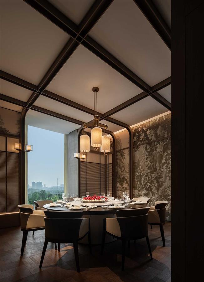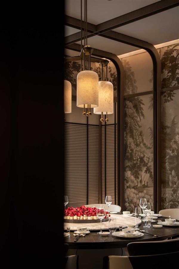 追尋于美學之外的設(shè)計,柘壹設(shè)計Z ONE?在規(guī)劃產(chǎn)品生態(tài)的同時豐富生活的精致度。一餐一酌、以食會友,鋪敘出對“品境、悅己、私享”的高奢情境描摹。室內(nèi)的復繁花紋、黃銅雕飾,室外的碧湖綠景、朗闊藍天,在內(nèi)外的無界銜接間,流露出觥籌交錯、觀湖望山的愜意,到訪賓客得以浸潤于自然、城市與人文的交融中,舒享私屬峰層生活體驗。