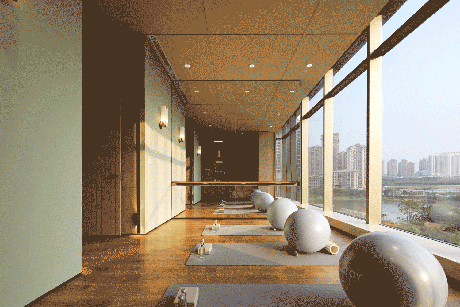 面朝陽光的瑜伽室,為使用者提供了一個擁抱自然、隨性舒展身體的鍛煉空間。在與窗外城市街景的相望下,歸于自我的本心與朗闊的湖畔景象,勾勒著心靈與自然的洄游,投射出彼此呼應(yīng)的共鳴之美。