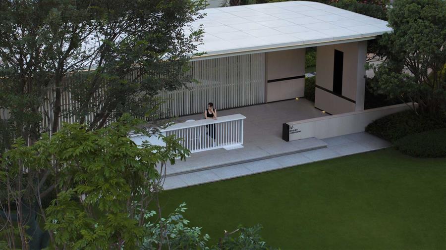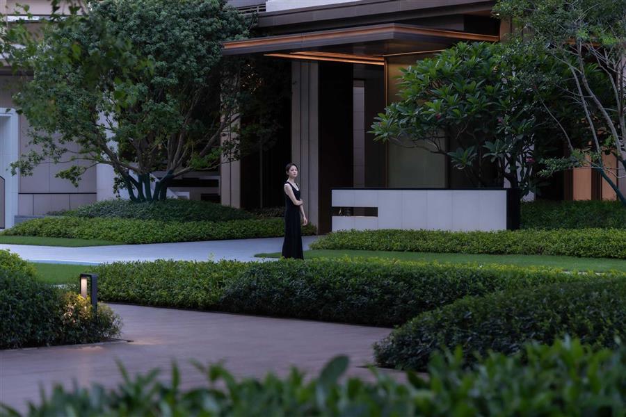 青蔥整齊的草丘鋪成蜿蜒小徑,指引人們歸家的路。暖橘色調(diào)的燈光徐徐散落在草丘上,讓黃昏后的歸家顯得寧靜而溫馨。