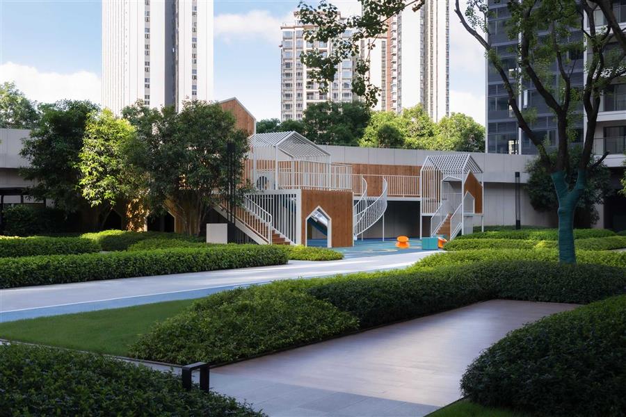 主題泡池、汀步、水滑梯、趣味座椅、水簾等的增設(shè),賦予泳池趣味性,滿足兒童戲水玩耍的需求。休閑平臺(tái)、熱身區(qū)等不同功能性的區(qū)域劃分,便利了家庭關(guān)照及戶外活動(dòng)。