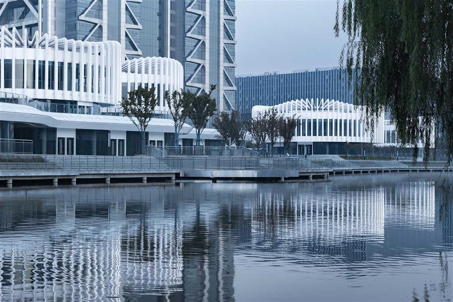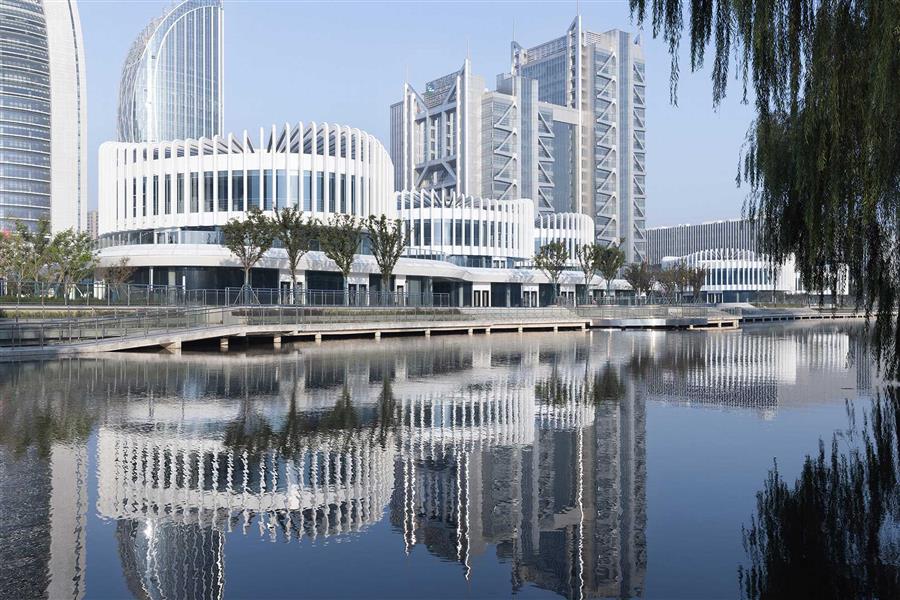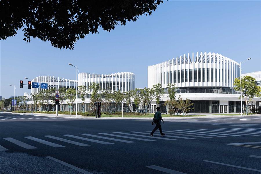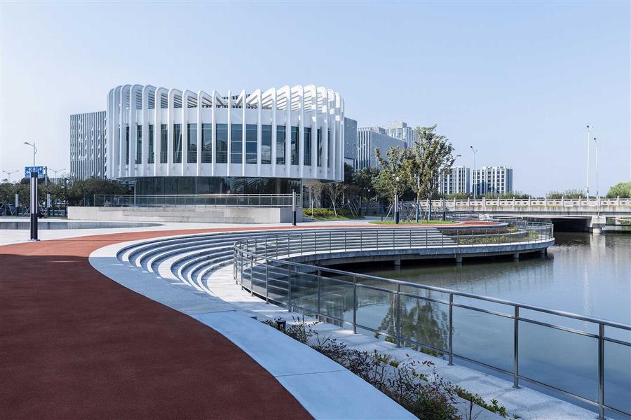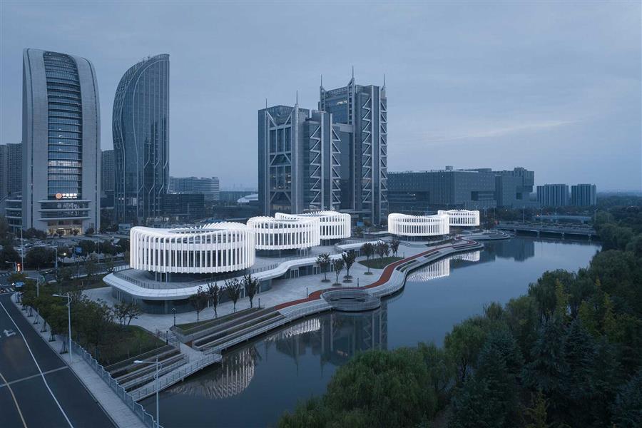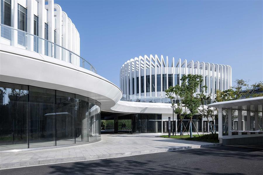 場地東側(cè)隔河而立的是紹興市圖書館,本案采用與之相同的白色主調(diào)與流暢線條,形成建筑語言上的呼應(yīng)。