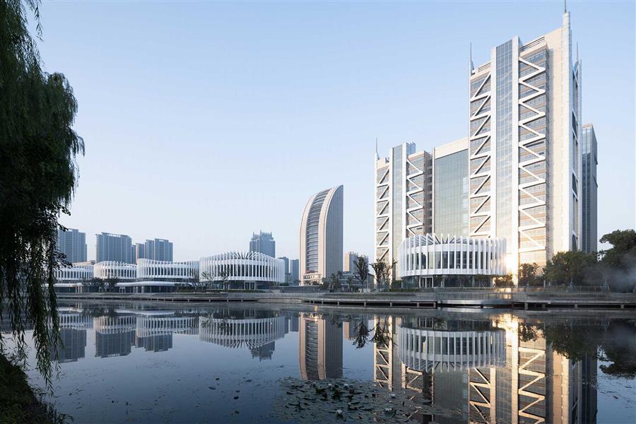 紹興鏡湖新區(qū)是市行政中心所在地,也是紹興的經(jīng)濟、文化和體育中心。鏡湖區(qū)域水系盤錯,生態(tài)環(huán)境極佳,綠意盎然的場地環(huán)境具有啟發(fā)性。本案位于鏡湖新區(qū)核心地段,毗鄰金融辦公區(qū),與紹興市行政中心和紹興市圖書館隔河相望,位置重要且敏感。
