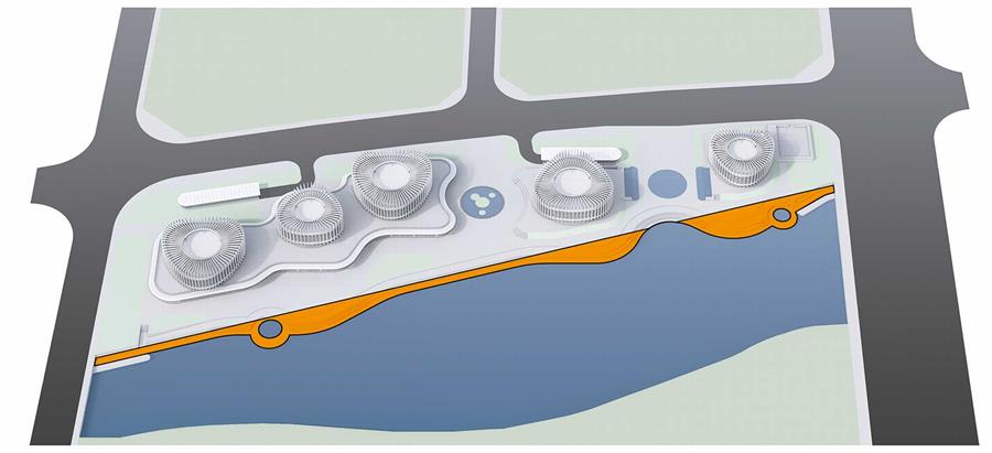 場地原始岸線近乎于直線,枯燥乏味。為了增加濱河空間的活躍度,UUA對原始河岸線進行調(diào)整,塑造出內(nèi)凹外凸的動感岸線。凸出原始河岸的部分采用架空平臺,保留原始河堤,避免填河造成的工程代價。
