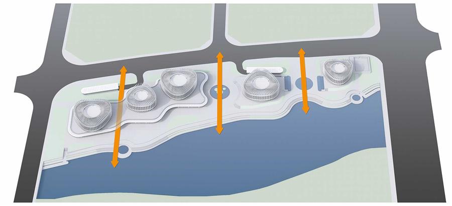 此外UUA從城市空間出發(fā),在城市道路和河流之間建立兩個廣場與一條通廊,形成周邊片區(qū)與濱水景觀的相互滲透,營造出一個更包容的親水城市空間。