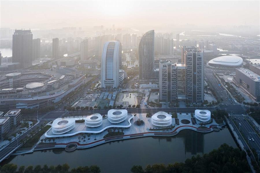 UUA采用景觀化的設(shè)計策略,塑造出流動感的建筑裙房以及場地景觀,同時引入五座“三瓣蘭花”形態(tài)的“蘭花閣”,以清晰的建筑語言呼應(yīng)紹興水鄉(xiāng)的地理特征以及培育蘭花的文化傳統(tǒng)。同時,本案也以優(yōu)美的頂部形態(tài),成為周邊高層建筑俯瞰的風(fēng)景。