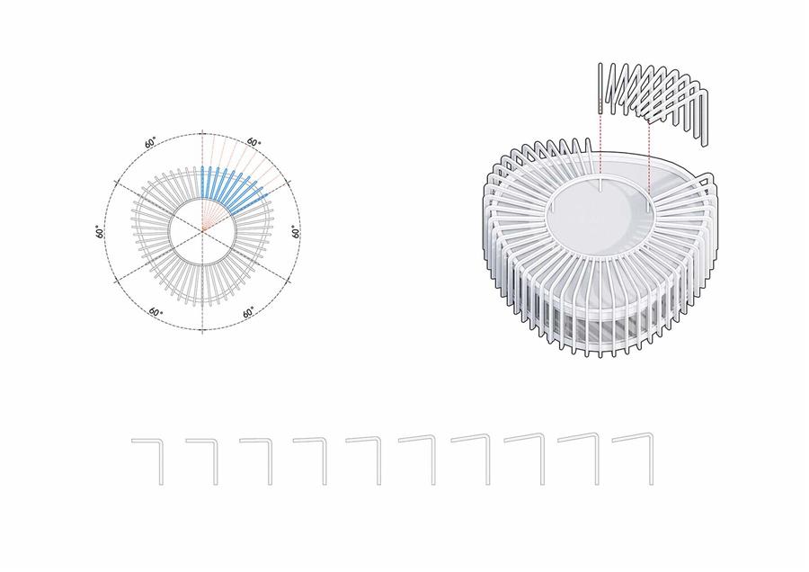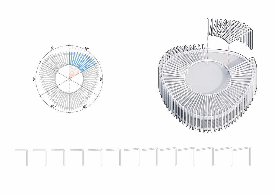 “蘭花閣”的外格柵的形態(tài)控制以1/6圓周,即60度為一組團,形成一組連續(xù)的變化趨勢。再通過組團的反復(fù)鏡像,實現(xiàn)了“蘭花閣”的起伏形態(tài)。