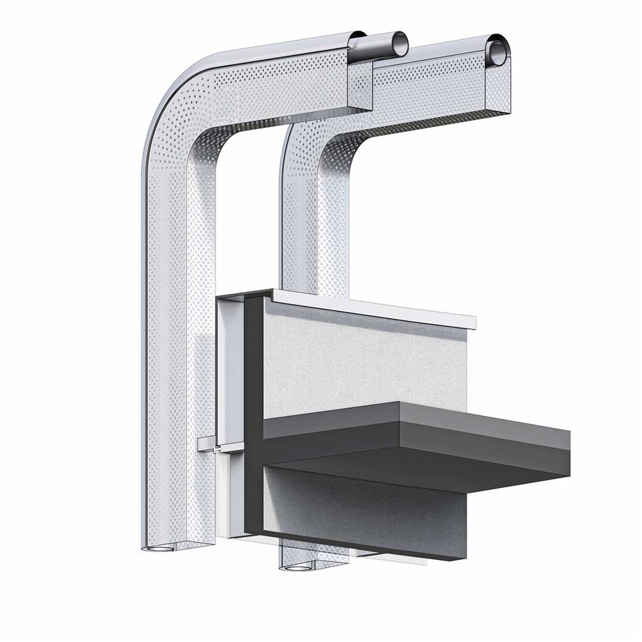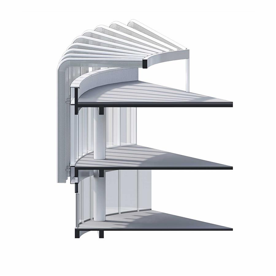 作為幕墻中最為重要和顯著的元素,外格柵的內(nèi)芯為圓形鋼管,起到結(jié)構(gòu)作用。外層由半圓弧的實面鋁板和矩形的穿孔鋁板組成。其中穿孔鋁板采用漸變的孔徑,形成虛實的過渡的效果,豐富了建筑的細節(jié)體驗。外格柵的設(shè)置還起到了對室內(nèi)遮陽,對周邊環(huán)境過濾自身玻璃光污染的作用。