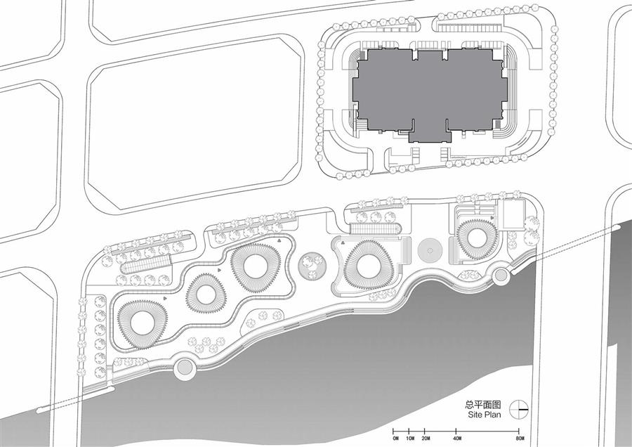 場地西側(cè)坐落著同為UUA設(shè)計的雙擎大廈,其主入口面向東側(cè)的河流。為協(xié)調(diào)兩座建筑的空間關(guān)系,本案設(shè)置軸線廣場,對位雙擎大廈主入口。廣場兩側(cè)均衡布置建筑形體,形成經(jīng)典的建筑空間序列。此外,本案還沿軸線將河岸做內(nèi)凹處理,引水入灣。