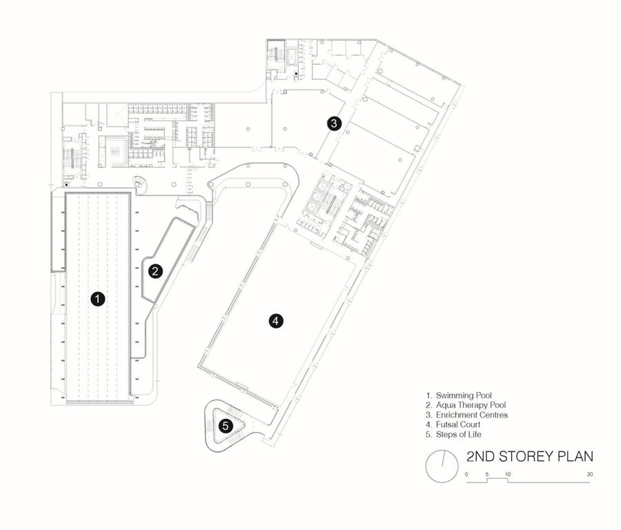 SAFRA Choa Chu Kang(SAFRA蔡厝港會(huì)所)坐落在廣闊的公共公園中心,是一個(gè)休閑會(huì)所,為國家軍人及其家屬提供廣泛的健身和保健活動(dòng),包括游泳池、五人制足球場、卡拉 OK 廳和水療中心。SAFRA CCK 的建筑風(fēng)格張揚(yáng)、獨(dú)特,讓人聯(lián)想到健身運(yùn)動(dòng)并從中受到啟發(fā)--從大膽的超大桁架到象征團(tuán)結(jié)和力量的預(yù)制顏料混凝土拱形正面。而在其堅(jiān)固的外表下,則是一個(gè)充滿活力的自然和人文社區(qū),通過一條中央主干線從公園流淌而入。其結(jié)果是自然與健身的無縫交錯(cuò),為社區(qū)注入了新的活力,重振了社區(qū)精神。