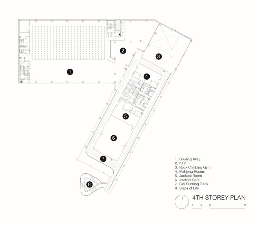 毗鄰?fù)ピ旱?"生命階梯 "是項(xiàng)目的垂直中心,它不僅將會(huì)所內(nèi)的健身設(shè)施連接在一起,還將公園的跑步路線與建筑第四層的空中跑道連接在一起。它體現(xiàn)了積極的流動(dòng)性,邀請游客登上 100 級臺階,打破了健身和公園僅限于地面的傳統(tǒng)觀念。它跨越了公共和私人、水平和垂直等不同領(lǐng)域,為會(huì)所注入了獨(dú)特的活力和熱情。會(huì)所內(nèi)的大容量空間沿建筑的伸展臂布置,以最大限度地利用自然光和交叉通風(fēng)。在空調(diào)空間內(nèi),采用了高性能的雙層玻璃,以減少熱量傳遞,從而顯著節(jié)約能源。