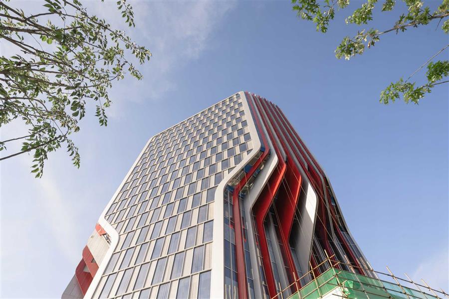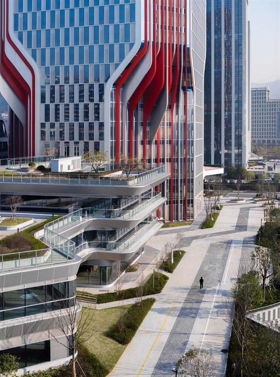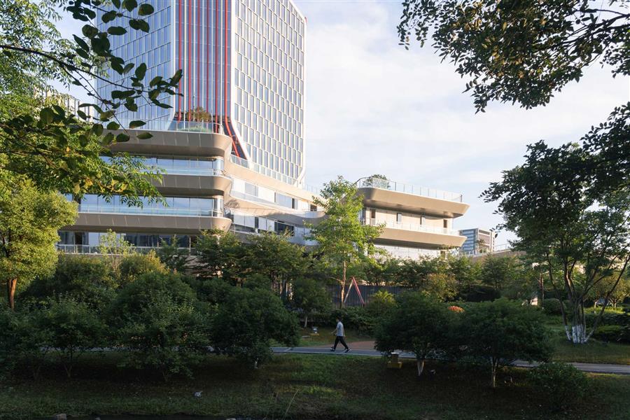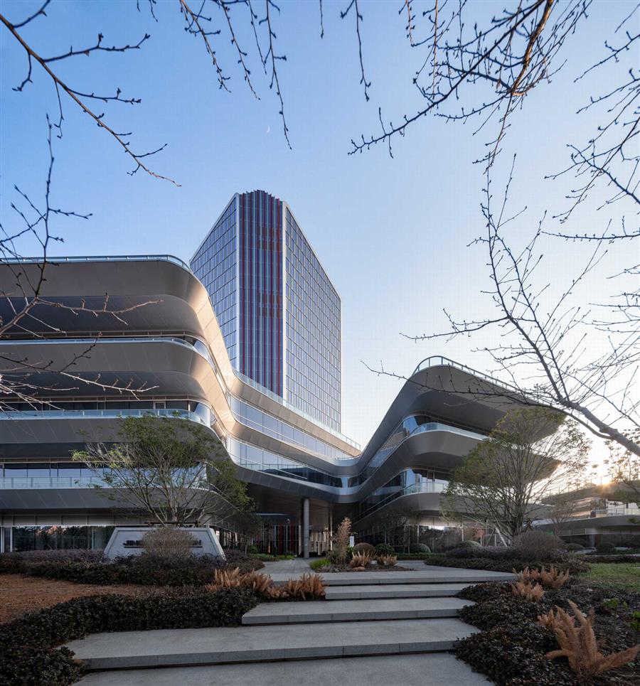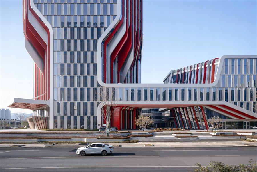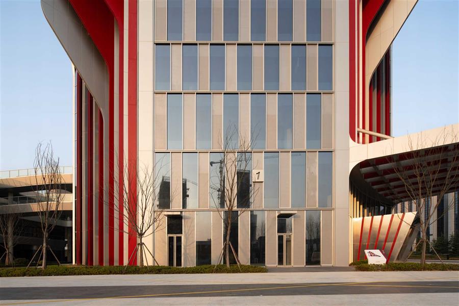 項目主樓的靈感源于汽車腰線,銀色建筑被張揚、動感的紅色曲線層層切割,為銀湖科技城的城市肌理增添一抹獨特亮色。