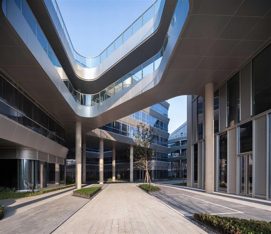 走入園區(qū),銀色遮陽鋁板通過角度變化賦予園區(qū)靈動的氛圍。裙房通過空中連廊鏈接,形成不同形狀大小的院落空間。