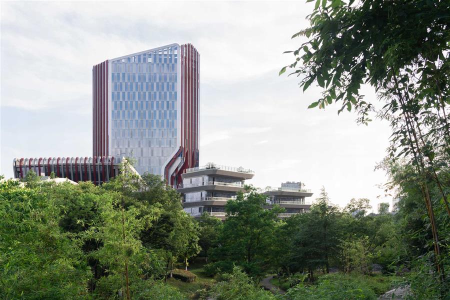 裙房整體朝向銀湖公園層層疊落,植物景觀為屋頂露臺劃分出張弛有度的休憩空間,連續(xù)的動線讓裙房屋頂成為一座可游可玩的空中花園。