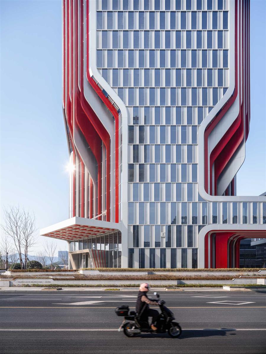 塔樓與沿路的1號樓采用統(tǒng)一的造型語言,頂部和側(cè)面被紅色的曲線勾勒,形成了園區(qū)主入口。在主干道旁形成令人駐足的城市景觀。