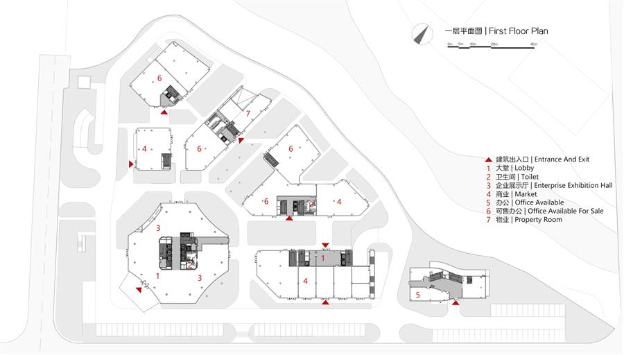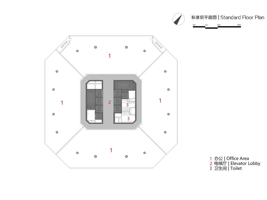 裙房位于塔樓北側(cè),用于對外租賃。建筑體量由大變小,靈活分割的平面布局對中小企業(yè)客戶友好,有利于形成產(chǎn)業(yè)集聚。建筑由東向西呈層數(shù)遞減的趨勢面向銀湖公園,弱化建筑體量,并擁有最開放的景觀視野。