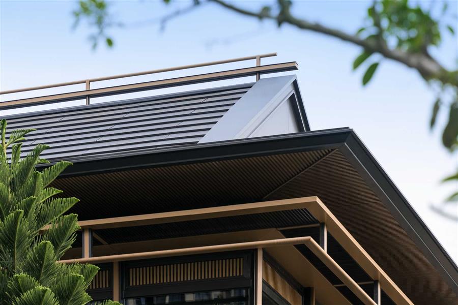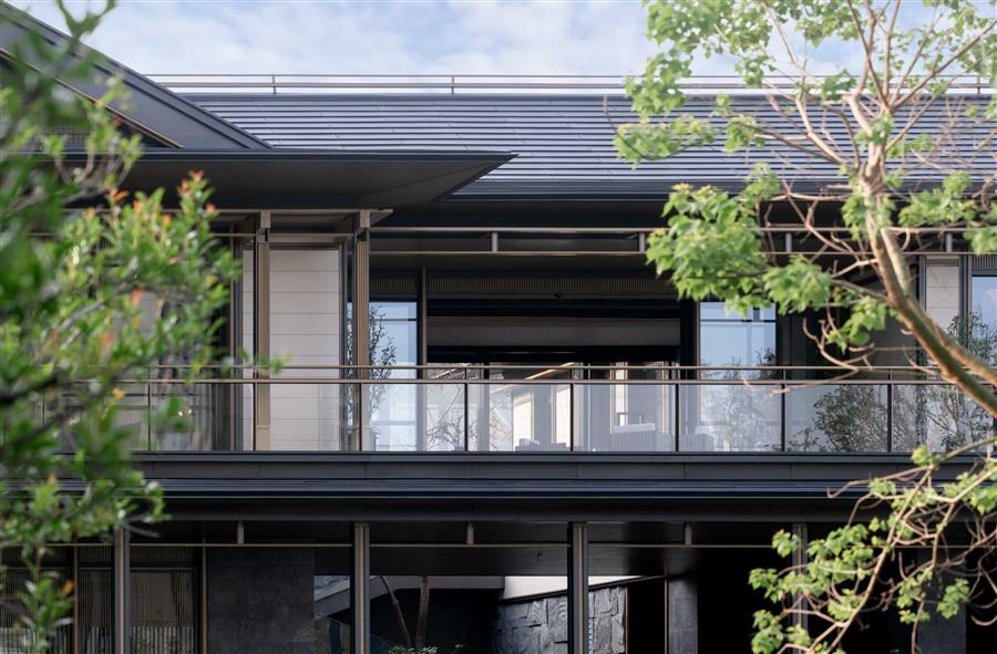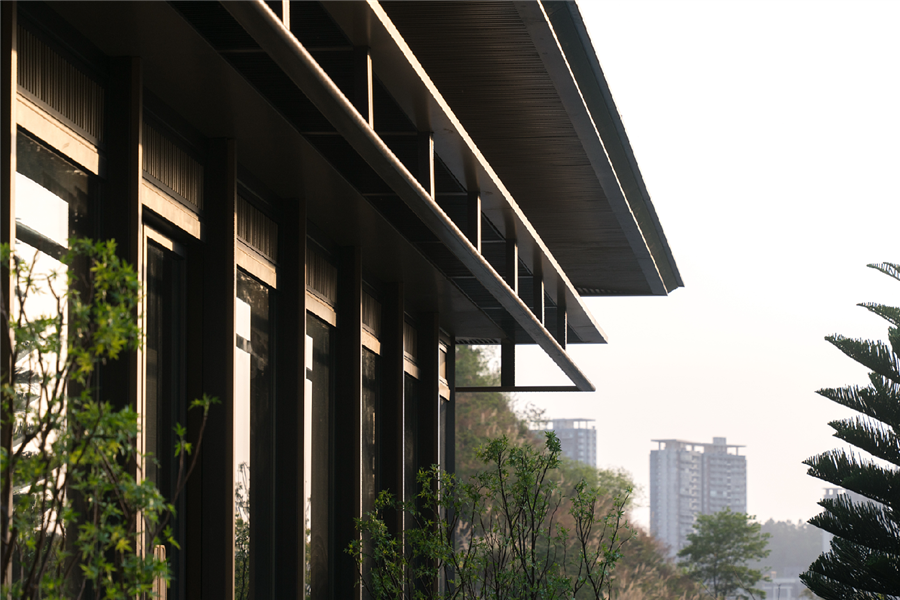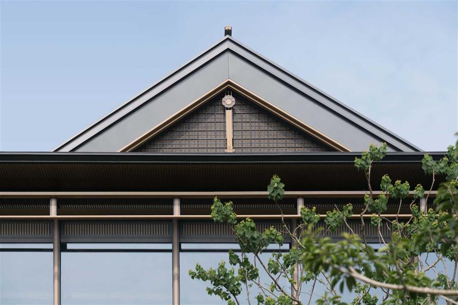 屋脊設(shè)計(jì)取消了傳統(tǒng)戧角裝飾和鴟吻的符號(hào),完全使用現(xiàn)代語(yǔ)言及材料進(jìn)行表達(dá),呈現(xiàn)纖細(xì)感、水平感。