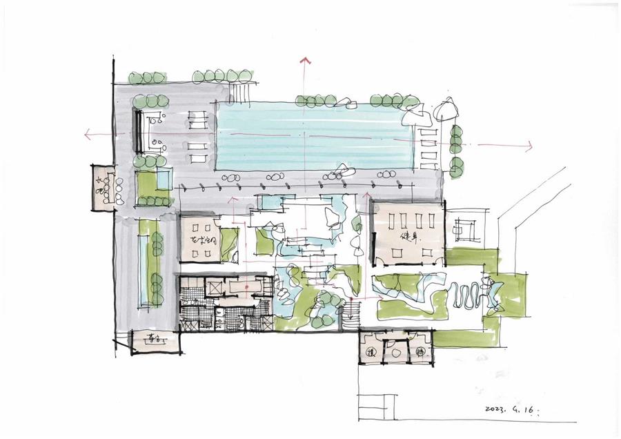 將景觀與室內(nèi)穿插處理,人群的流動(dòng)仿佛置身一個(gè)精彩雅致的園林中,泳池、茶室、宴會(huì)、棋牌、瑜伽、健身等功能,讓社區(qū)老人、孩子、青年、中年人各個(gè)年齡層均可以在其中感受到社區(qū)的氛圍,建筑、景觀、室內(nèi)的融合打造景致、閑適的空間。