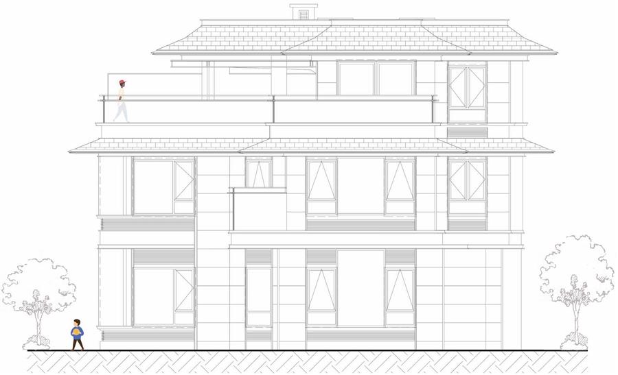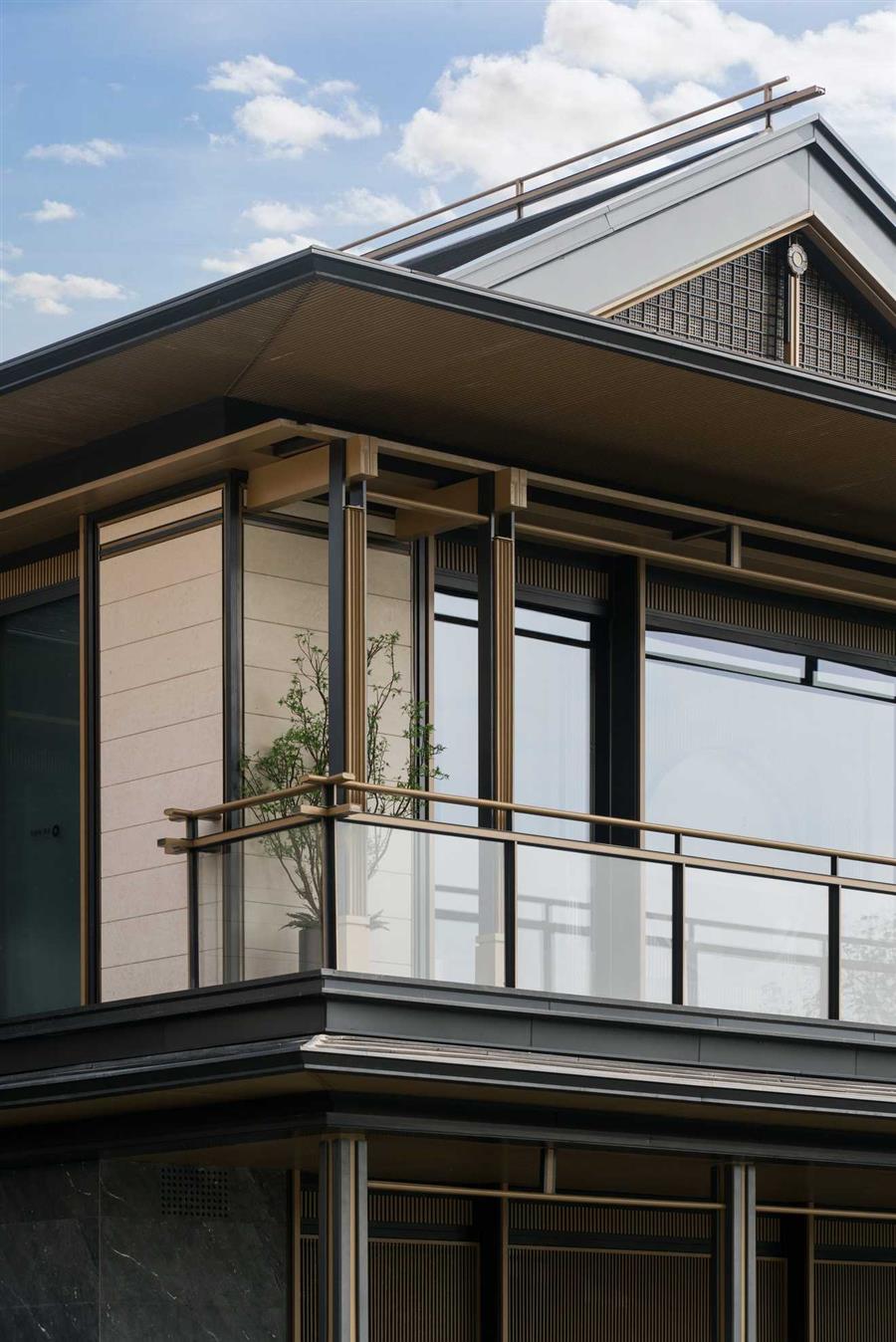 尋杖在轉(zhuǎn)角望柱搭交而伸出,研究宋式建筑中的欄桿,用現(xiàn)代設(shè)計(jì)語(yǔ)言打造定制化極簡(jiǎn)的雙層絞角造。
