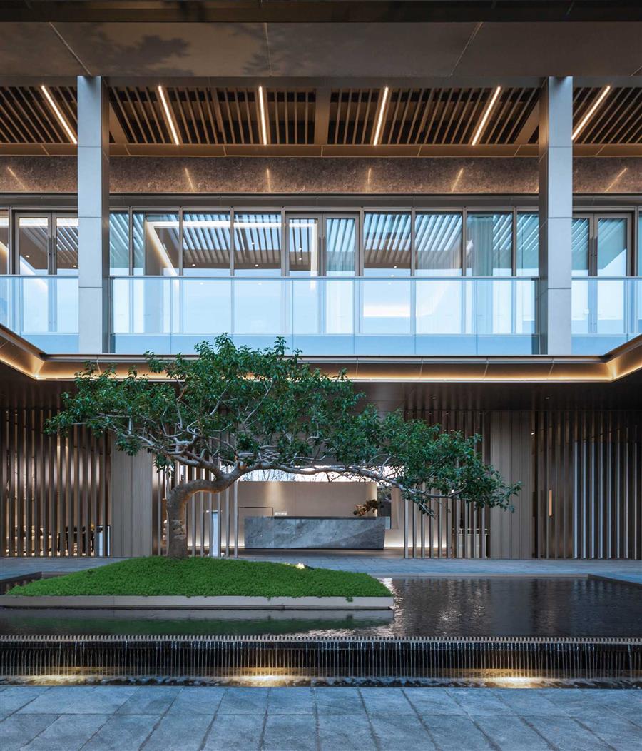 下沉庭院為地下會(huì)所提供采光的同時(shí),在立面上豐富了空間的層次關(guān)系。樹(shù)木、水波、光影、與建筑交織成一副靜謐的畫(huà)卷。