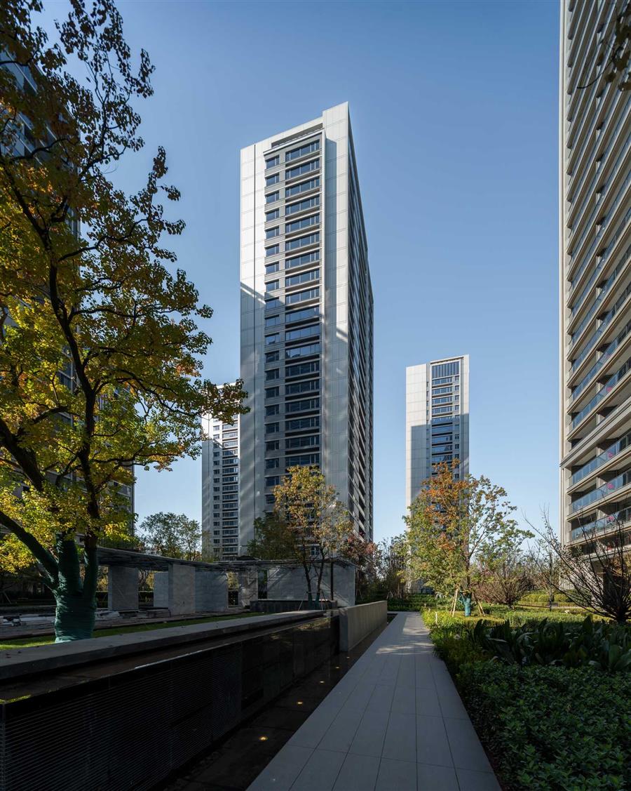 設(shè)計(jì)師通過樓棟錯位排布,在保證實(shí)際容積率的同時,依然確保了規(guī)劃形態(tài)較為舒朗,每棟樓都享有均好的樓棟間距和景觀。從城市角度鳥瞰,建筑風(fēng)格和地塊內(nèi)的超高層辦公風(fēng)格統(tǒng)一,強(qiáng)調(diào)體塊感+橫線條,充滿未來感與科技感。