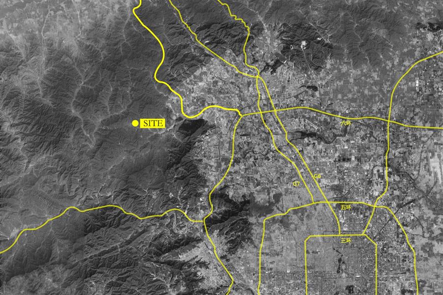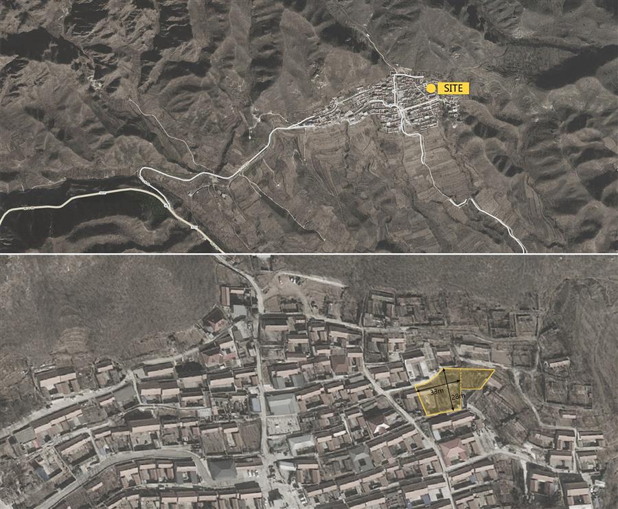 基地的位置在整個(gè)村落的最東側(cè),其東、西、北側(cè)均有民宅包圍,南側(cè)一面作為景觀延展面,連綿起伏的山脈一字排開(kāi),是北京郊區(qū)罕見(jiàn)的壯美風(fēng)景。整塊場(chǎng)地由兩塊相鄰的宅基地構(gòu)成,寬33米,長(zhǎng)28米,邊緣呈不規(guī)則形狀。
