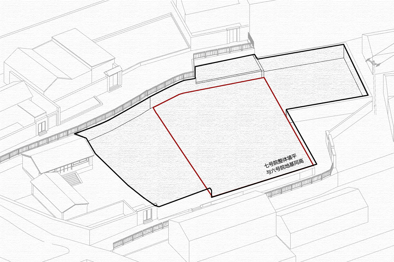 兩個(gè)地塊分別被命名為6號(hào)院(西側(cè))和7號(hào)院(東側(cè)),我們將7號(hào)院原有的地面進(jìn)行整體填充,使其與6號(hào)院地坪等高,也為后來(lái)的圍合型院落創(chuàng)造了條件。