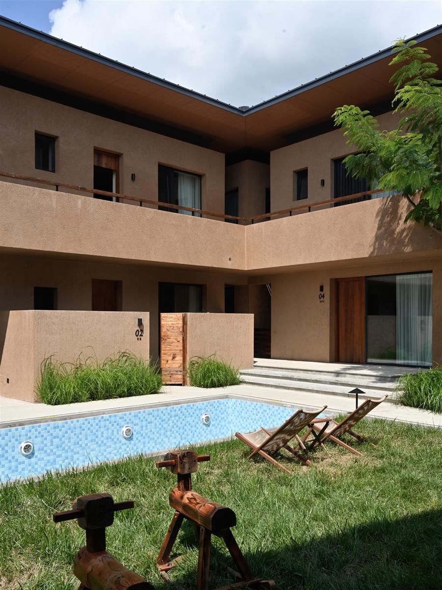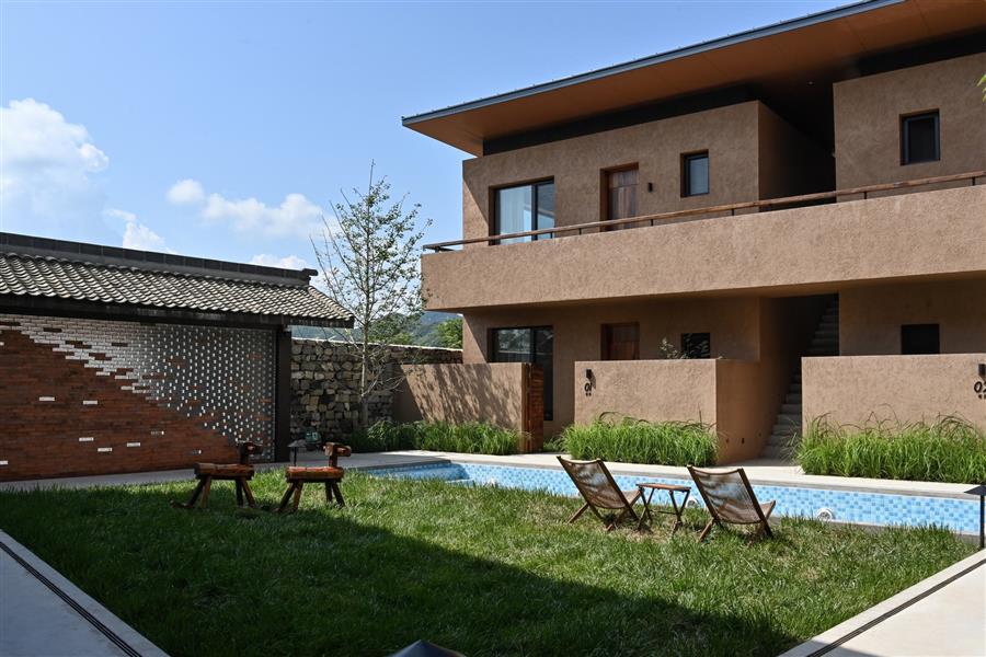 隨著后勤場(chǎng)地的確定,各區(qū)域的功能也就明朗了起來(lái)—將7號(hào)院L型的結(jié)構(gòu)從中間斷開(kāi),留一條后勤通道至后場(chǎng)區(qū),南側(cè)建筑的一層設(shè)置入住登記、后勤布草以及廚房,二層最好的觀山位置則留給客房。