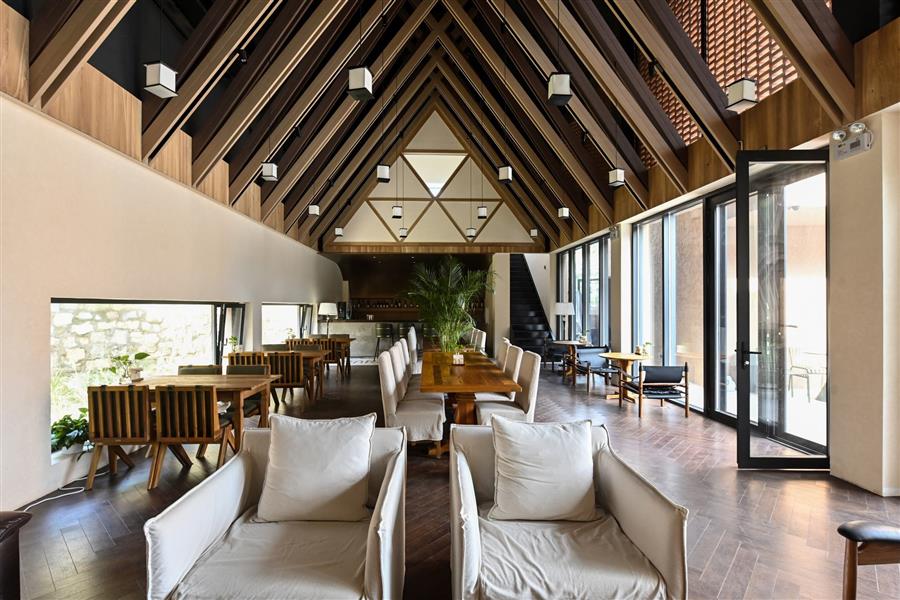 平面布局中,我們?cè)谝粚釉O(shè)置入住登記、酒吧、咖啡等公共空間,值得一提的是北側(cè)的宴會(huì)廳,由于政府對(duì)于宅基地的建設(shè)要求,最終形成的是一個(gè)超高的二層挑空空間。為了平衡空間視覺(jué)感受,增加儀式感,我們?cè)诳臻g中設(shè)置互相搭接的三角形鋼架,以降低層高帶來(lái)的尺度上的不匹配。猶如教堂般的多功能空間也為承接不同類(lèi)型的活動(dòng)增加了可能性。