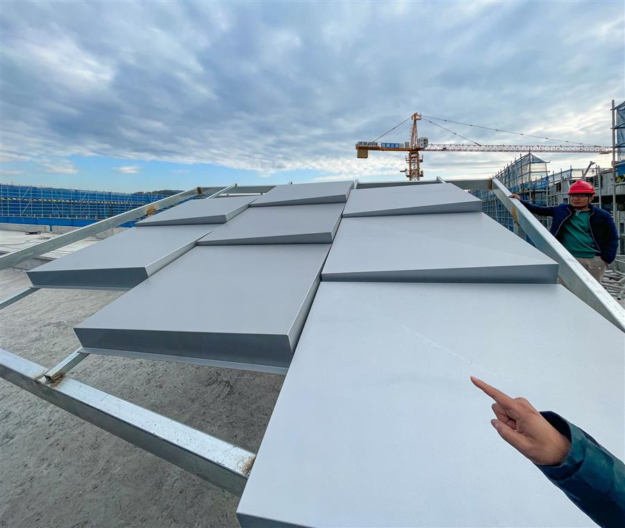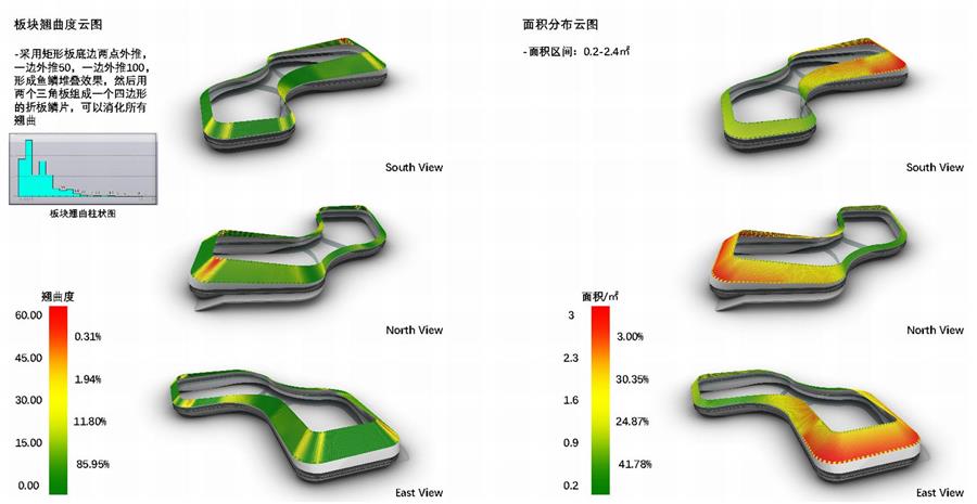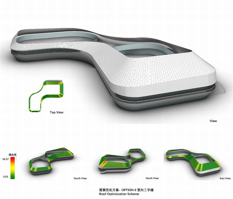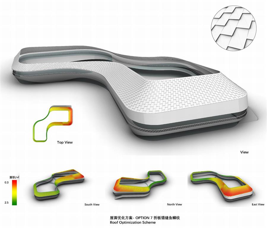 折板錯縫方案的每塊金屬板上有一道折痕,隨著光線變化,會產(chǎn)生一種優(yōu)美的鱗片的效果。設(shè)計團隊希望通過這道道折痕,在整體曲線之外,點線結(jié)合,給造型再增加一個視覺層次。