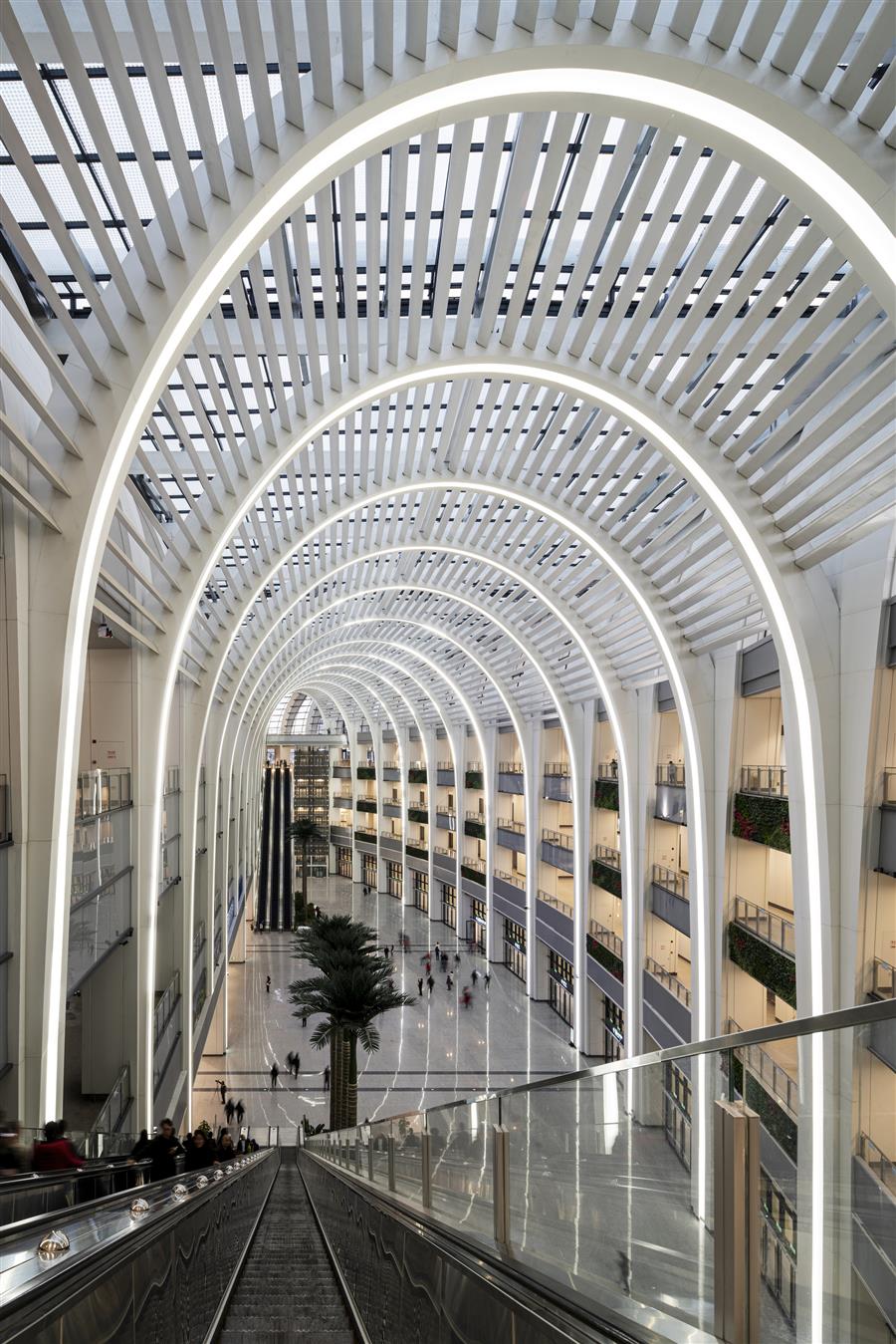 光谷沿南北方向布置,因此總是光線充足,是一個(gè)視野開(kāi)闊。同時(shí)為了兼顧采光和遮陽(yáng),我們?cè)诜治鋈晏?yáng)角度的基礎(chǔ)上,沿著拱梁配置了3種角度的百葉,以實(shí)現(xiàn)最佳的采光效果。我們?cè)谌巳喝菀淄A舻闹醒氩糠直M可能地制造陰影,人流移動(dòng)較多的兩側(cè)扶梯周?chē)鷦t盡量保證采光確保明亮。