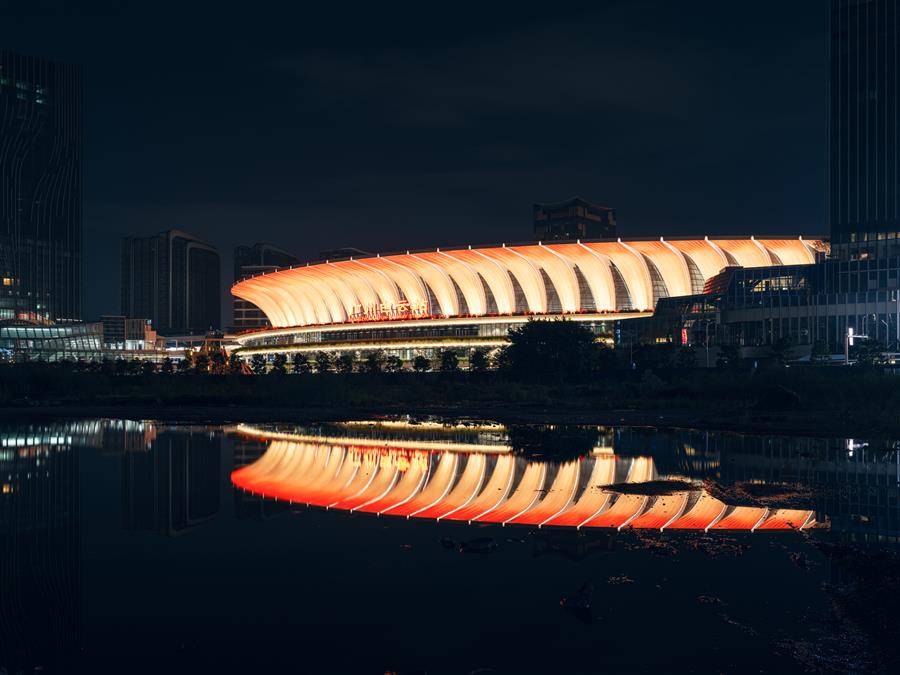 花瓣底部安裝有上照燈,在夜間可以根據(jù)主題向花瓣膜上投影不同光線,使車(chē)站在城市中呈現(xiàn)出豐富的姿態(tài)?;ò晖鹑缗e行畫(huà)布,人們的活動(dòng)在其襯托下成為了主角。這一人城交融的場(chǎng)景,正是新時(shí)代車(chē)站的立面與城市的象征。
