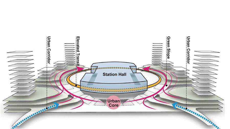 另外,我們還在綠環(huán)的最高點(diǎn)——3層標(biāo)高處,同時(shí)也是南北高鐵上蓋部分設(shè)置了公共空間“呼吸廣場(chǎng)”。在平常,它可與開(kāi)發(fā)結(jié)合用作當(dāng)?shù)氐幕顒?dòng)廣場(chǎng),在春節(jié)、國(guó)慶節(jié)等客運(yùn)高峰期可以增設(shè)進(jìn)站口作為車(chē)站廣場(chǎng)使用。這個(gè)彈性空間以靈活變化的形態(tài)體現(xiàn)了車(chē)站與周邊開(kāi)發(fā)、地區(qū)之間吞吐吸納、交流融通的關(guān)系,是TOD開(kāi)發(fā)的象征性場(chǎng)所之一。
