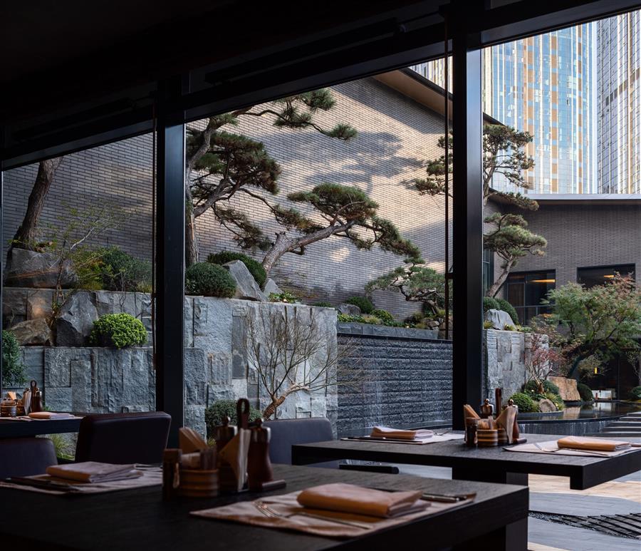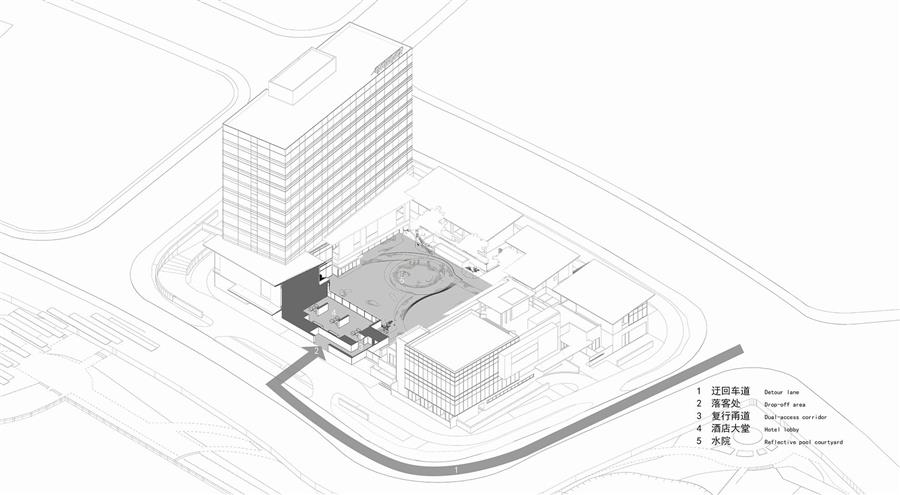 區(qū)別于商務酒店入口的豪華、高大的常規(guī)設置,我們以林路迂回,將酒店入口遠離嘈雜的主車道,行車落客處不作任何筆墨華彩,僅設一樸素門洞,沿幽深洞口轉(zhuǎn)折復行十余步而進入酒店大堂,則忽而豁然開朗,二十米長的中庭景觀如山水畫卷徐徐展開,引發(fā)旅客的驚嘆。