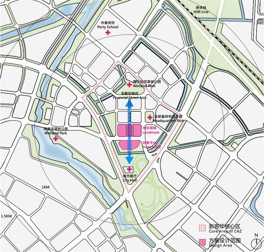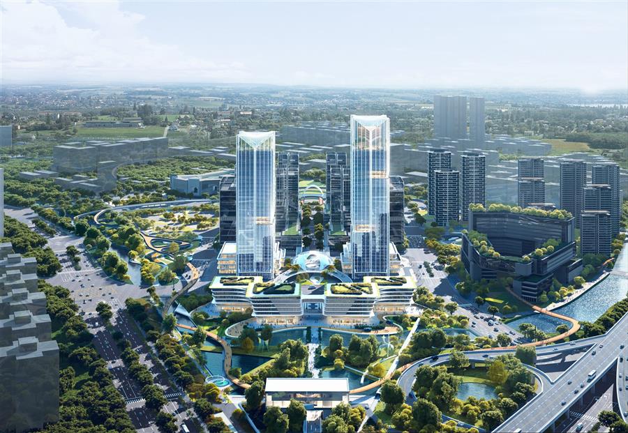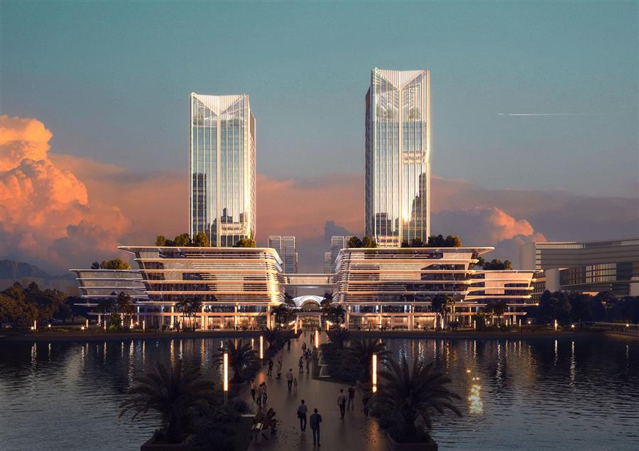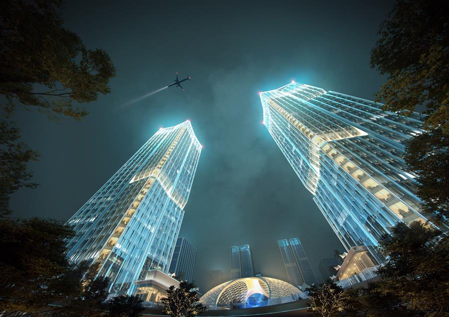 《楚辭》有云:“鳳凰翼其承旗兮,高翱翔之翼翼”。設(shè)計(jì)尋根荊楚文脈,以“鳳舞云霞·才聚楚荊”為敘事主線,將楚人崇鳳的集體記憶在當(dāng)代建筑的詩(shī)意表達(dá)中凝固為永恒。項(xiàng)目布局充分契合上位城市設(shè)計(jì),金融雙子塔沿片區(qū)中央主軸相對(duì)而立,形成對(duì)稱統(tǒng)一的門戶形象。
