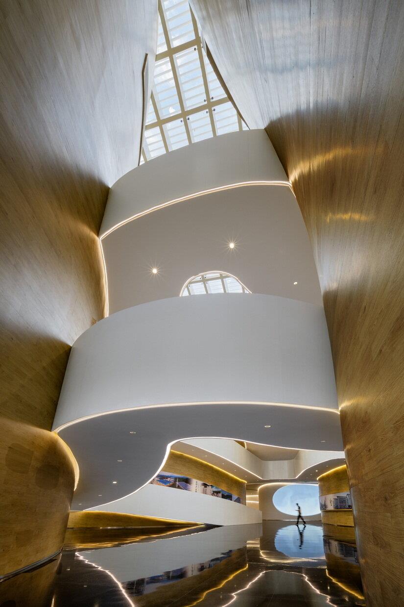Through the Sunner Museum, the Chinese team of Atelier Alter Architects reimagines how industrial buildings coexist with their surroundings. Suspended courtyards float beneath the roofscape, while a public path lets visitors ascend to the top, where panoramic views of the factory, forest, and Futun River unfold. At the museum’s heart, four silo-shaped shear walls support a column-free exhibition hall, with a 25-meter-high vertical atrium flooded with soft northern light, ideal for large-scale agricultural exhibits and immersive experiences.