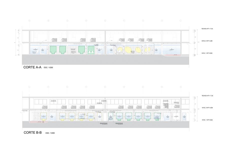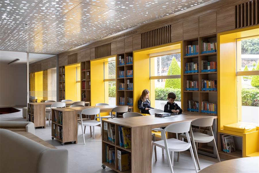 The ground floor of the pavilion, previously designated for classrooms, was transformed into a versatile environment that maximizes space usage. Walls were widened to integrate them as storage and organization areas, and new windows were opened to improve natural lighting and create cozy corners for reading and conversation. Additionally, a chromatic strategy was incorporated to differentiate educational levels: yellow, linked to creativity and concentration for the youngest, and turquoise, which brings calm and energy for teenagers.