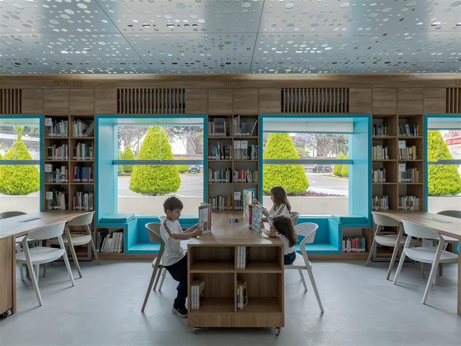 展館的底層,以前被指定為教室,被改造成一個多功能的環(huán)境,最大限度地利用空間。墻壁被加寬,以整合它們作為存儲和組織區(qū)域,新的窗戶打開,以改善自然采光,創(chuàng)造舒適的角落,供閱讀和交談。此外,還采用了色彩策略來區(qū)分教育水平:對于最年輕的孩子來說,黃色與創(chuàng)造力和專注力有關,而對于青少年來說,綠松石則帶來了平靜和活力。
