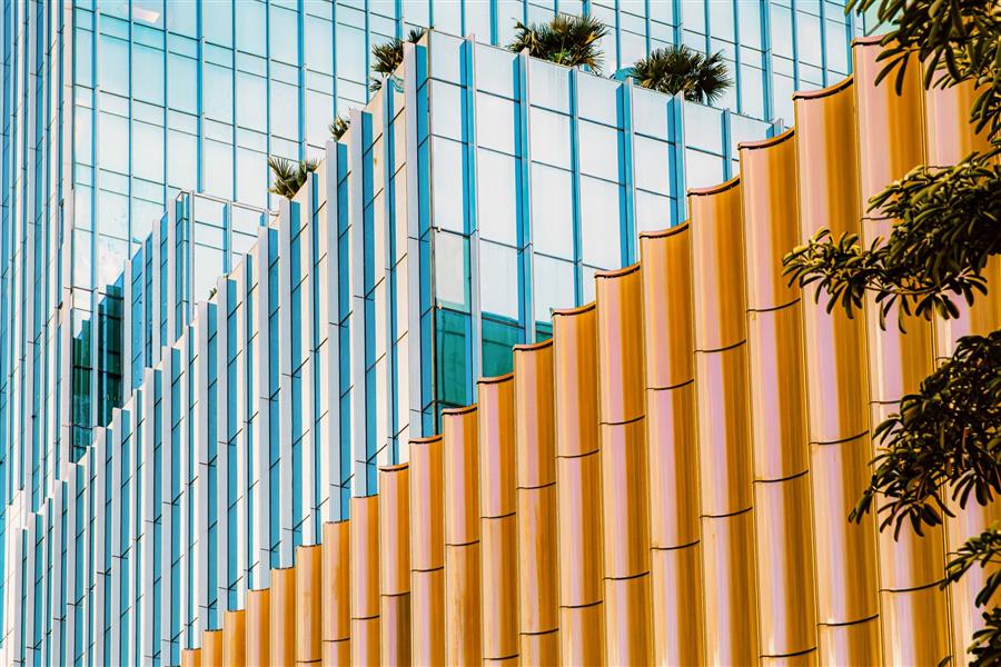 酒店主塔樓立面采用玻璃幕墻,設(shè)計(jì)簡(jiǎn)潔現(xiàn)代,在城市天際線中脫穎而出。在此基礎(chǔ)上,塔樓立面設(shè)有豎向裝飾條,為酒店住客提供充足遮陽,并提升整體美學(xué)效果。