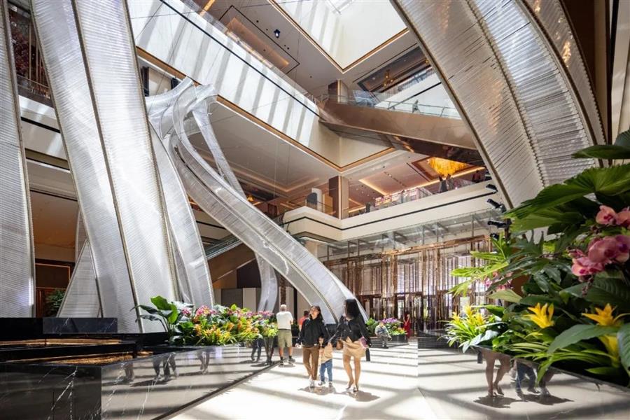 裙樓的外立面采用弧形退火玻璃搭配銅色豎向裝飾條,打破了周邊玻璃幕墻的視覺單一性。轉(zhuǎn)角處設(shè)有巨型LED媒體墻,為建筑注入視覺活力。玻璃中庭采用天窗設(shè)計(jì),引入自然光線直達(dá)首層,營造迷人氛圍的同時(shí),減少人工照明需求,提高了能源效率。多層次的裙房設(shè)計(jì)增強(qiáng)了通透性,無縫連接酒店及其他康樂設(shè)施,確保訪客通行無阻。