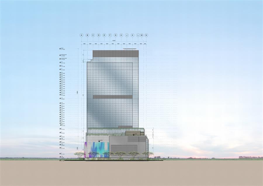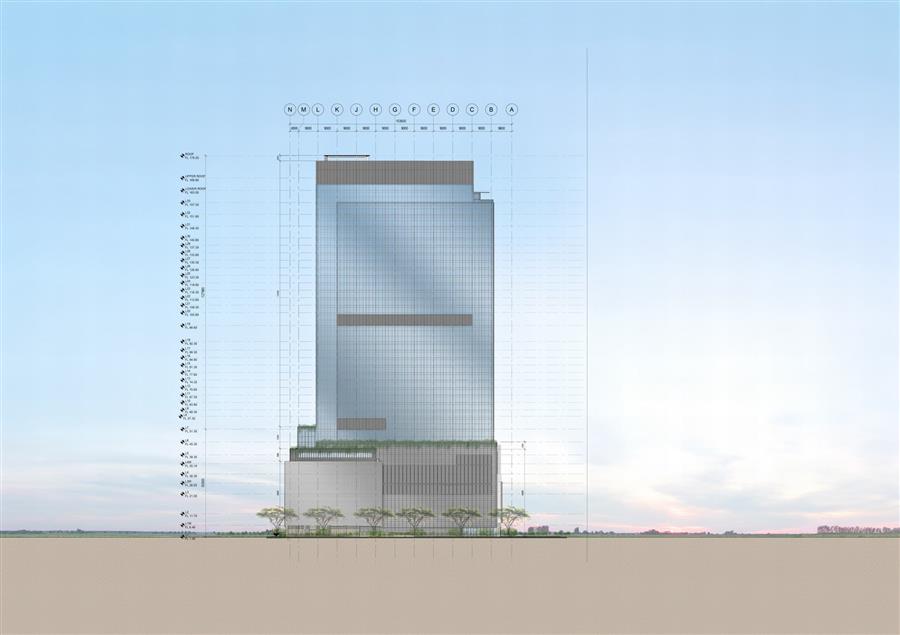 酒店塔樓體量向裙樓延伸融為一體,高聳挺拔的形象提升了項(xiàng)目的昭示性,使其成為區(qū)域地標(biāo)。塔樓朝向經(jīng)過精心設(shè)計(jì),以減少西曬影響并優(yōu)化各方位視野。宴會(huì)中心置于裙樓另一端,為活動(dòng)布置提供了最大化空間,同時(shí)在裙樓屋頂?shù)钠脚_(tái)層形成了核心的公共及活動(dòng)空間。