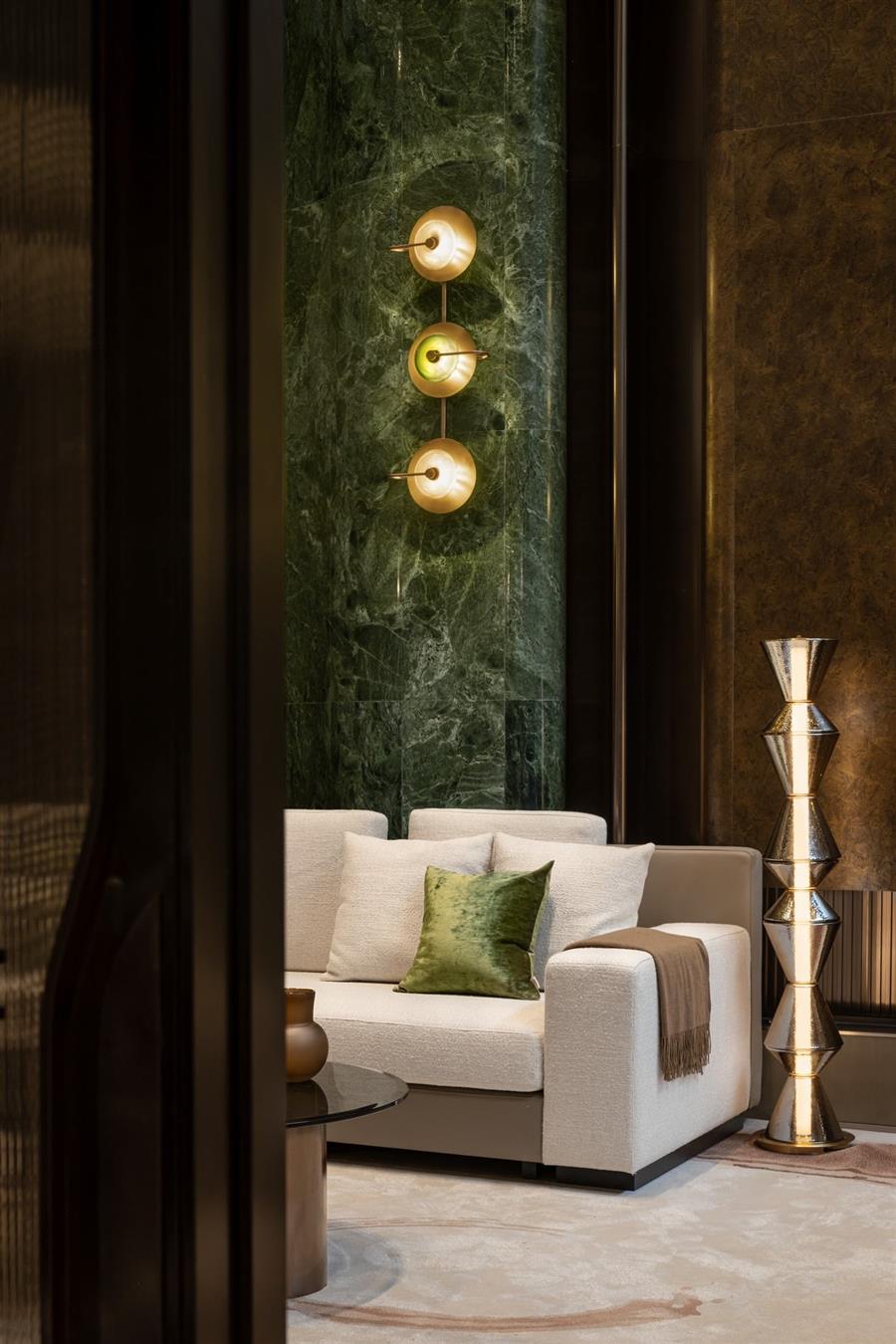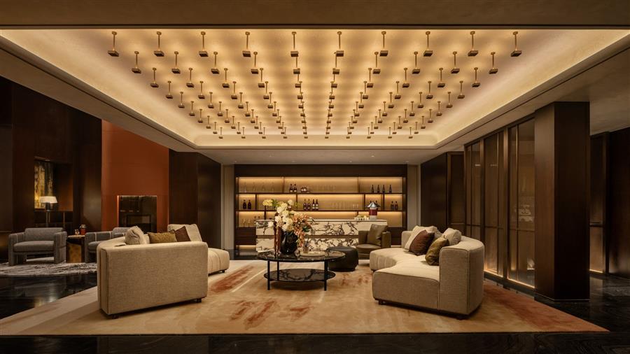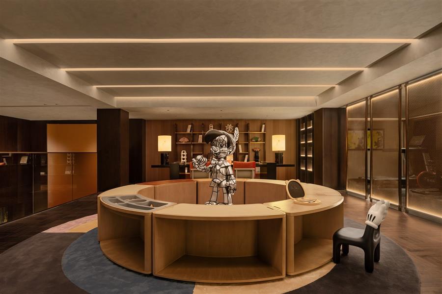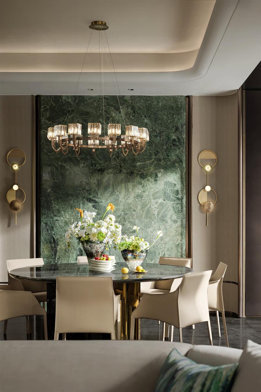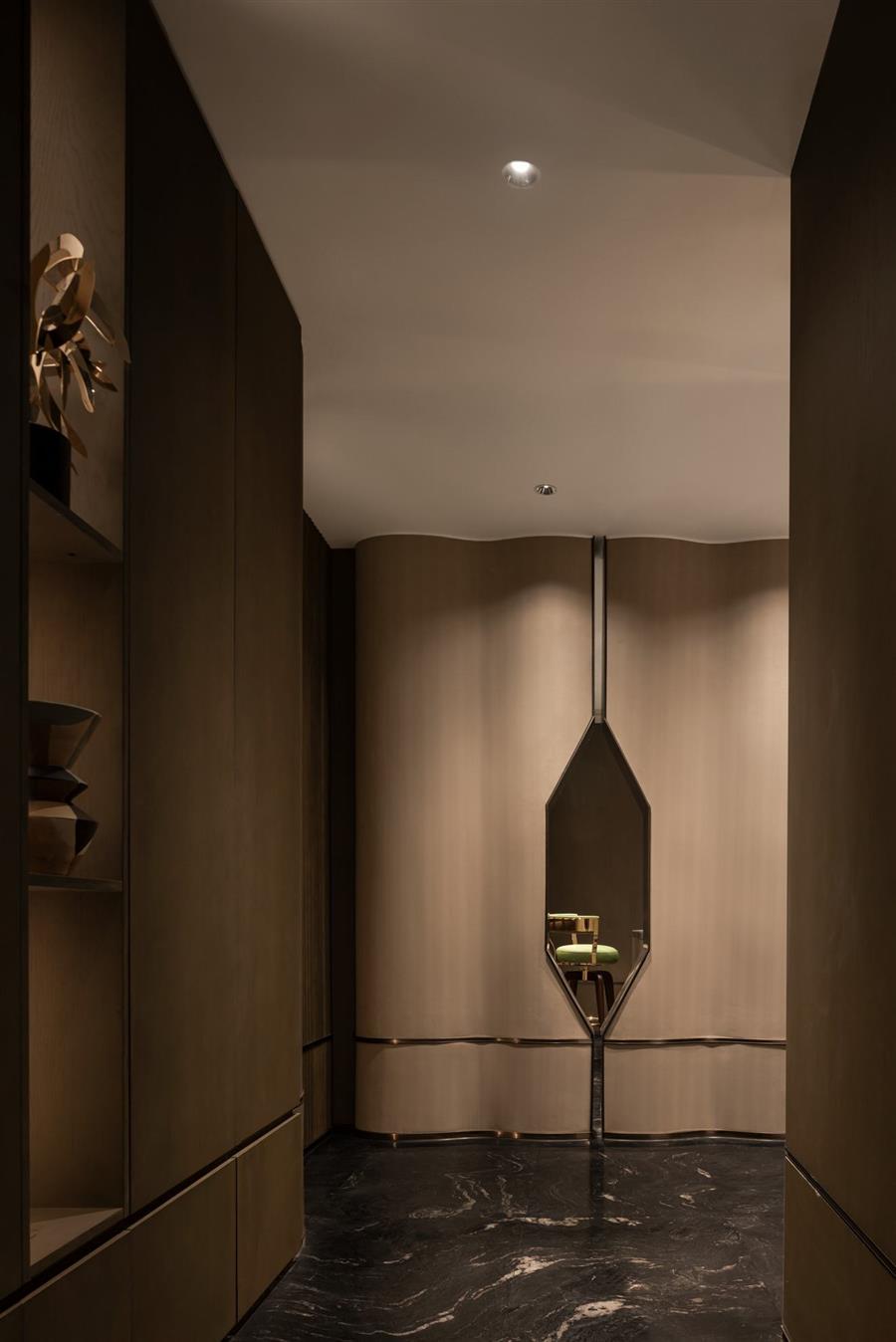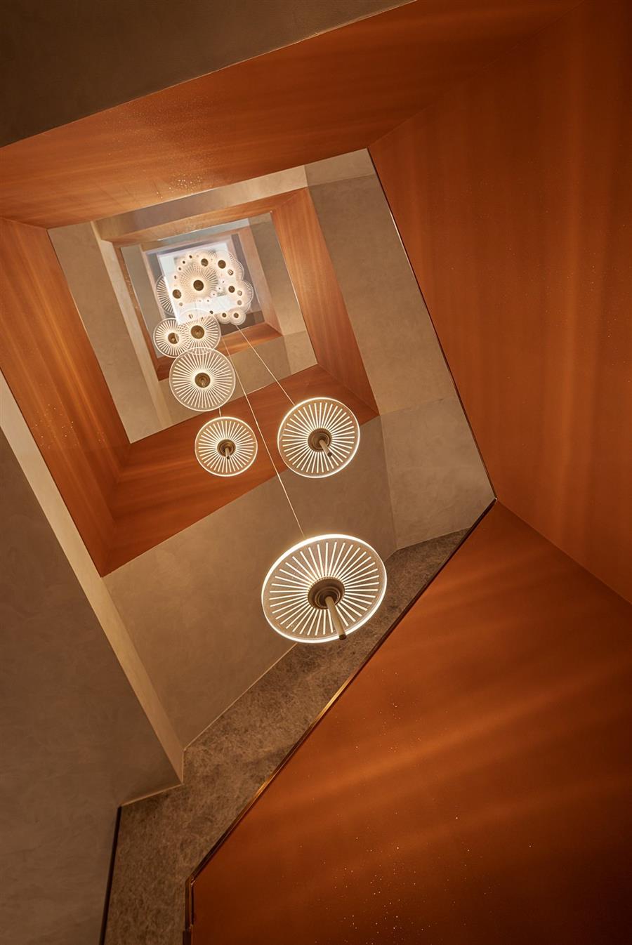 “以張為發(fā),以弛為蓄”,那樓梯間的落燈自上而下筆直垂落,圓盤搭配線性燈鱗次櫛比,循環(huán)而上猶如春日湖面雨落微波,徐徐蕩漾。光與影在空間中不同層次的藝術(shù)表達(dá),順著樓梯扶手層層疊進(jìn)扣人心弦。樓梯略帶擴(kuò)張的轉(zhuǎn)角迎風(fēng)而上,指引著空間精神本質(zhì)。大家風(fēng)范,領(lǐng)者姿態(tài)于踏步之間彼此穿插,為空間的視覺構(gòu)建與感官賦予雙重享受。