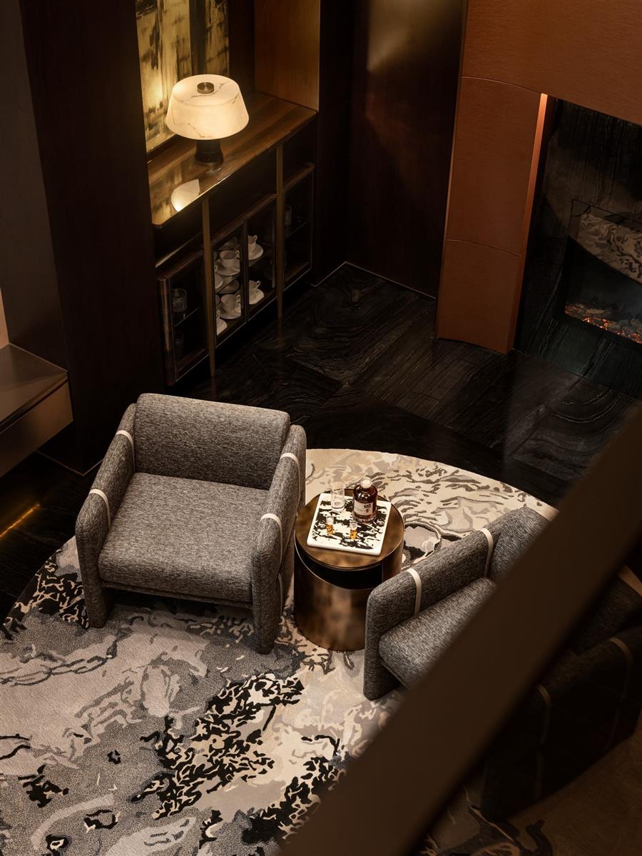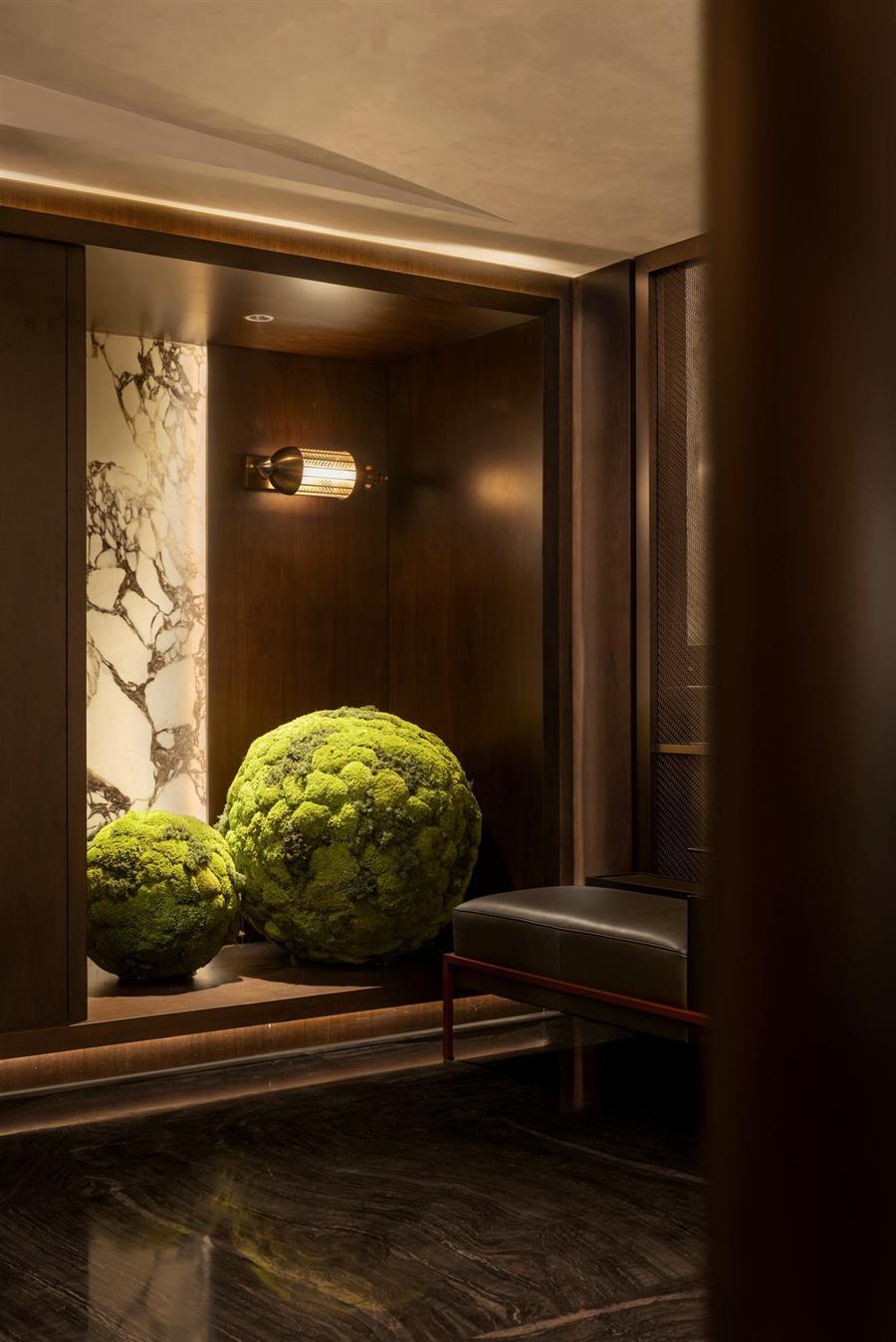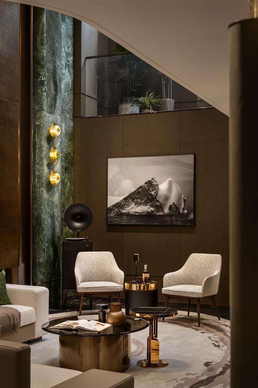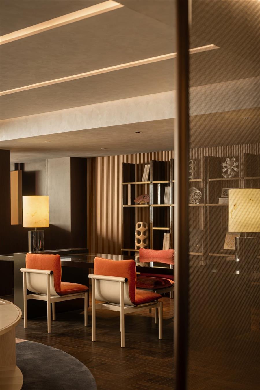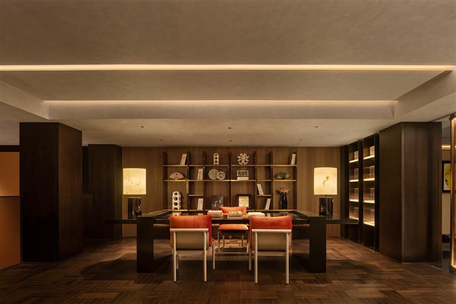在軟裝上,中熙設(shè)計(jì)保持中國人骨子里的待客之道,以圍合的對(duì)話方式陳列,木色飾面與奢石,在柔和的壁燈映射下,呈現(xiàn)出氤氳的朦朧感,耳邊傳來膠片的聲響,光陰與歲月在此靜靜地沉淀與流淌。