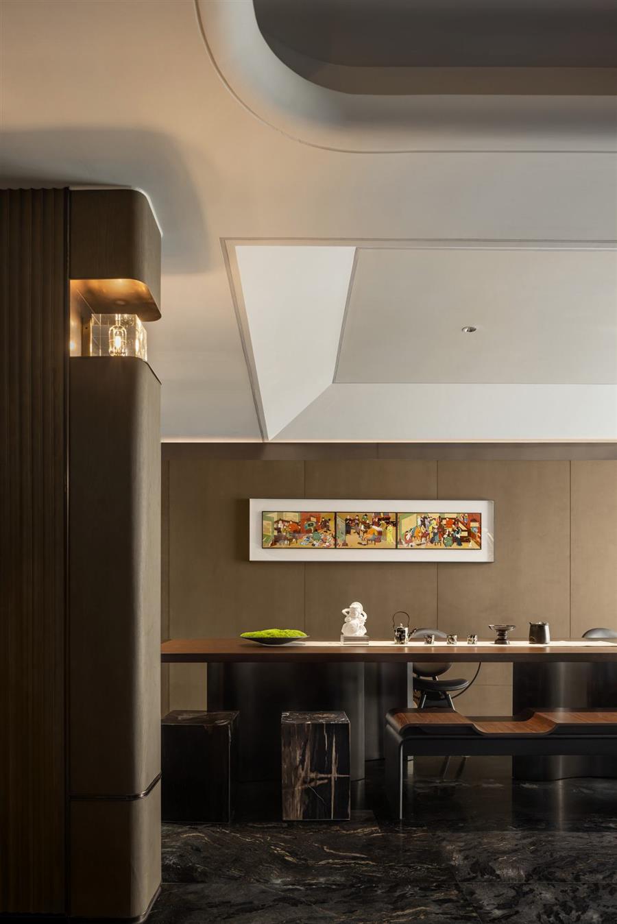 將流線型的設(shè)計(jì)引入空間,銜接夾層與負(fù)一,在傳統(tǒng)上著手創(chuàng)新彎曲夾層線條搭配玻璃曲面,優(yōu)化會(huì)客區(qū)的挑空同時(shí),柔美線條賦予的更是新潮與傳統(tǒng)、張揚(yáng)與內(nèi)斂的碰撞柔和。抬頭仰望,完成交流、互動(dòng)的多元姿態(tài)。