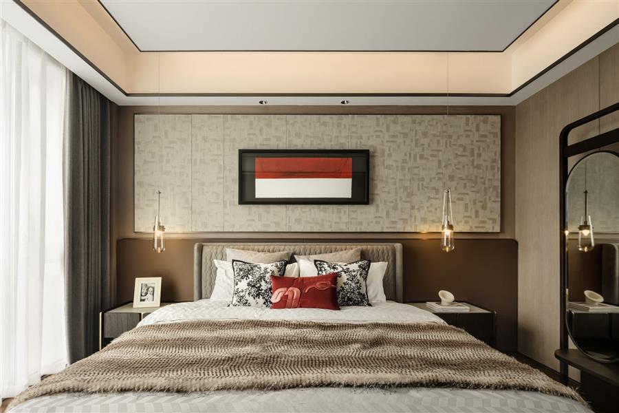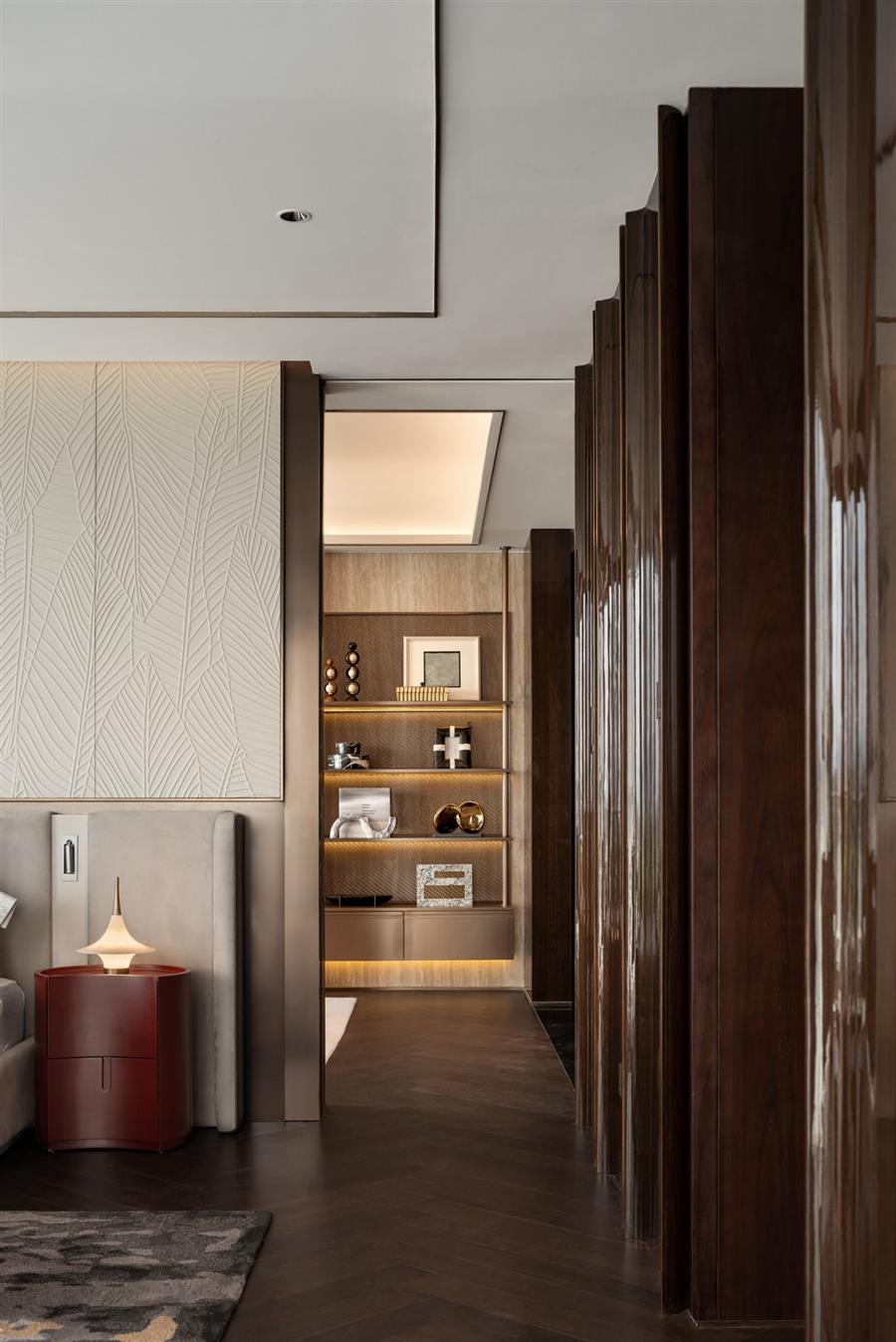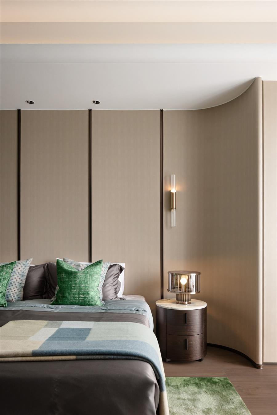步入休閑區(qū),以圓弧轉(zhuǎn)角過渡,床頭背景的造型利用木飾面做材質(zhì)以及豎列隔柵做疊加。獨(dú)具趣味的擺件安置于每一個(gè)空間,為休閑區(qū)域帶來別樣的柔情和身份的標(biāo)簽。