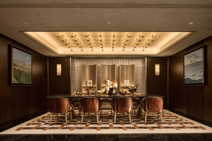 移步轉(zhuǎn)換,懸浮奢石的雙面功能,一面對(duì)客一面表達(dá)極具家族秩序的盛宴,展示酒柜與細(xì)膩的木材紋路勾勒出自然的古典之居。頂部的造型到體塊的穿插,通過美學(xué)解構(gòu)、重構(gòu),蘊(yùn)含東方韻味的新派裝飾,結(jié)合燈光布局,圓桌私宴,隱喻出現(xiàn)代與古典共存。