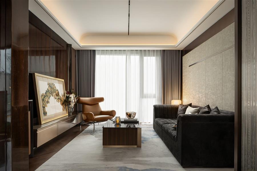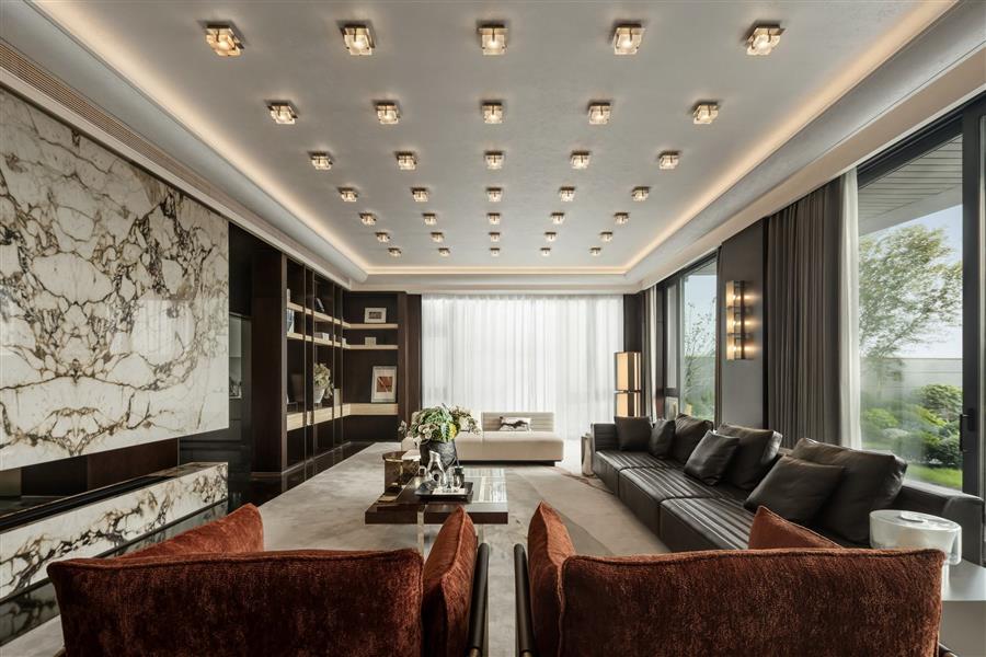 移步一層會(huì)客廳,映入眼簾的是硬朗的會(huì)客廳帶個(gè)人氣勢(shì)磅礴的視覺感,身份的厚重借由深色木皮的古典氣韻,頃刻展開。體塊化的沙發(fā)呼應(yīng)體塊懸浮,布局疏朗有致,彰顯出濃郁的藝術(shù)氣質(zhì),地面的紋理如筆墨暈染向四周迸發(fā),步步生花與墻面奢石相互呼應(yīng)。華貴的氣韻搭配深色飾面,光在空間的轉(zhuǎn)軸下內(nèi)外溢動(dòng)。