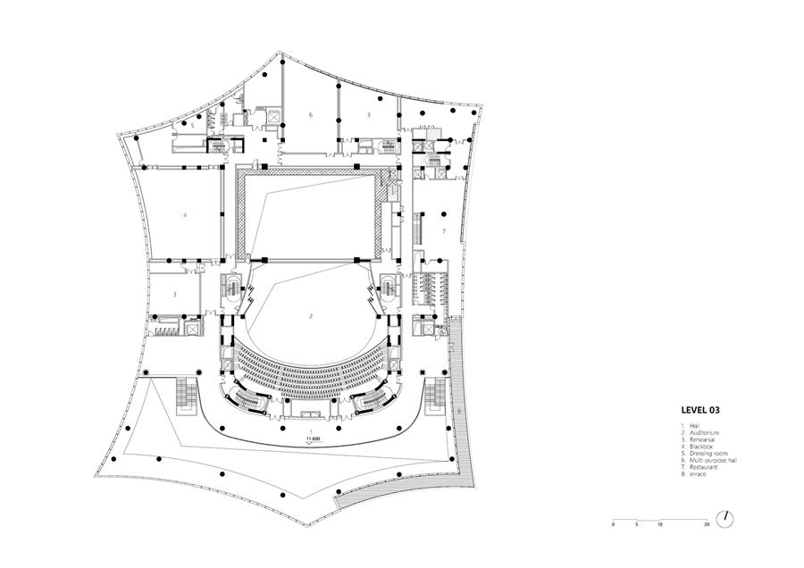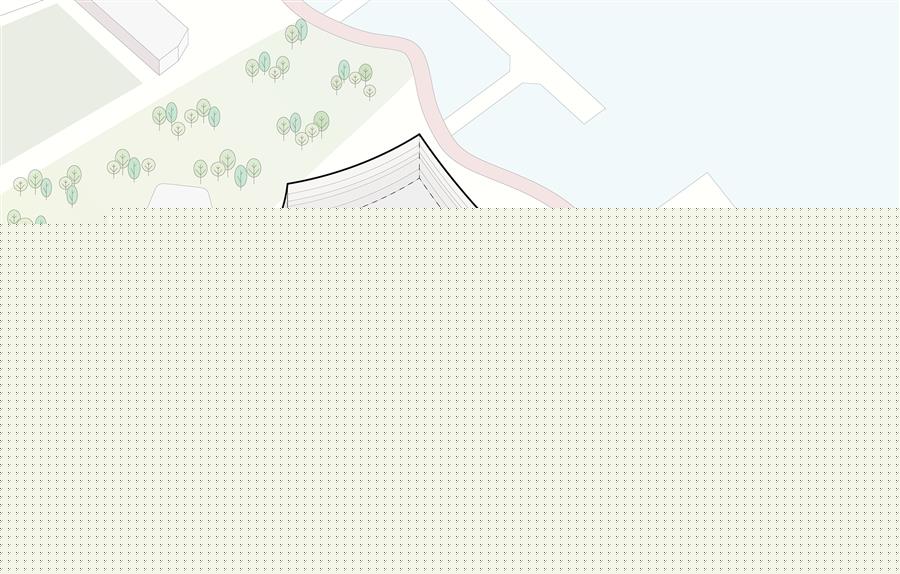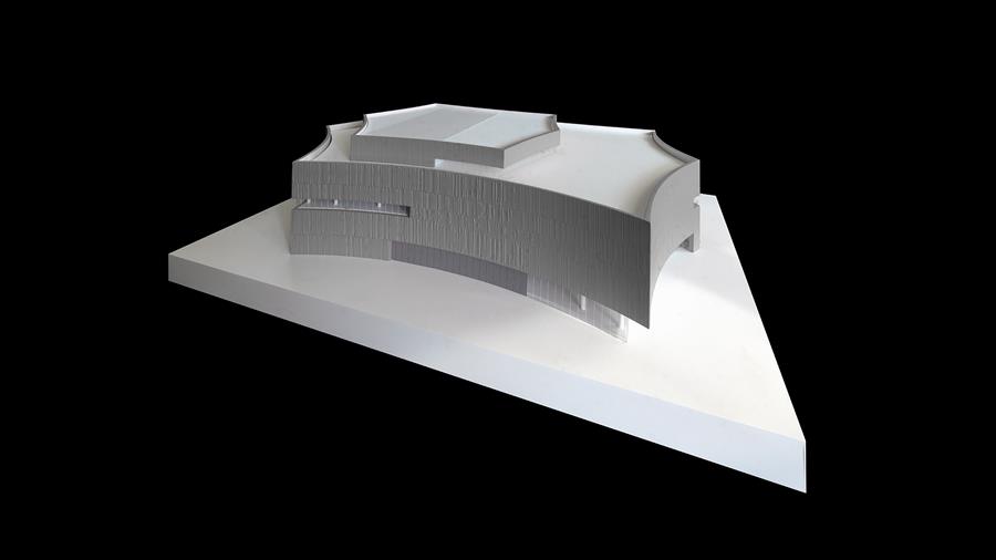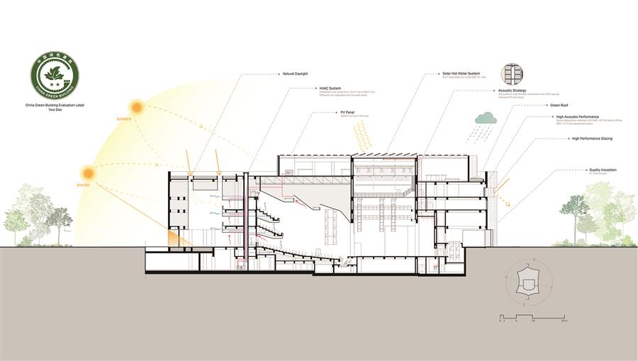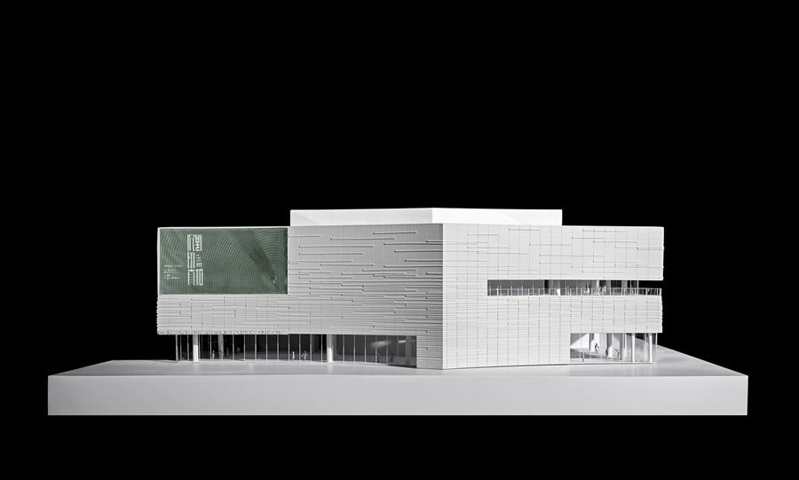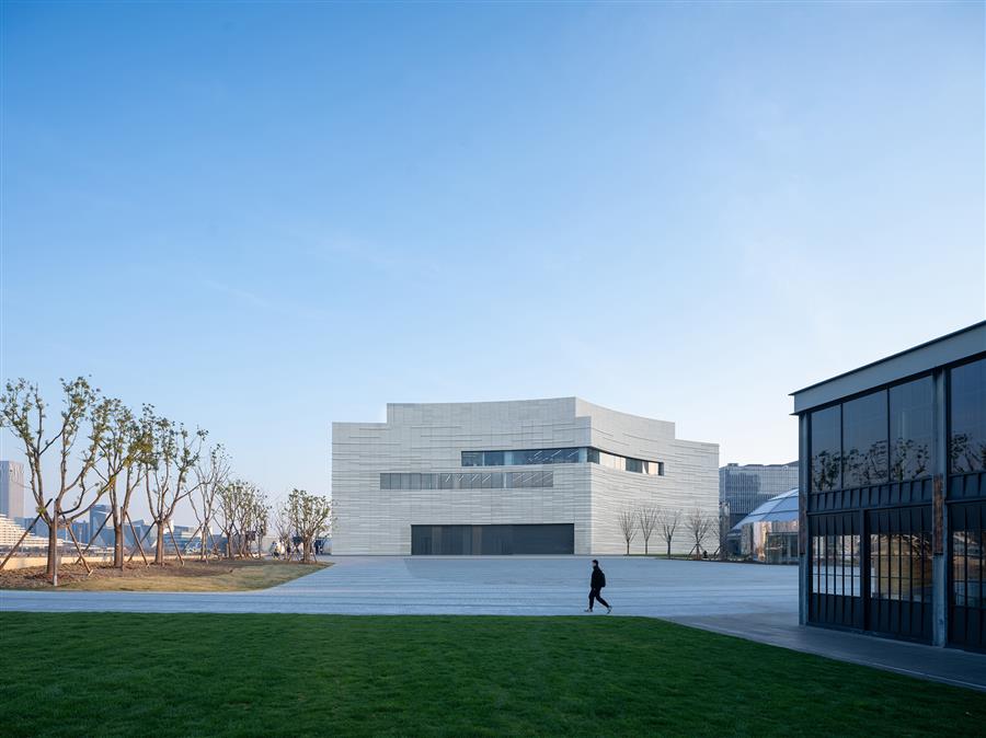 The new theater is conceived as one half of a yin-yang partnership with the newly opened West Bund Dome, a renovated and adaptively reused historic structure adjacent to the theater. The dome is translucent, exuding light in the evenings, while the theater is monolithic and abstract. The dome was once a pre-homogenization facility for China's largest cement production plant; the theater celebrates this heritage as a new concrete mass. Glass Fiber Reinforced Concrete (GFRC) was designed in a series of horizontal organic forms that are composed to mimic the constant movement of the Huang Pu River.