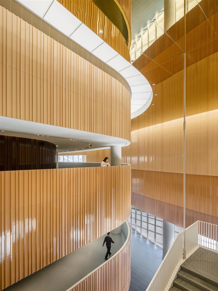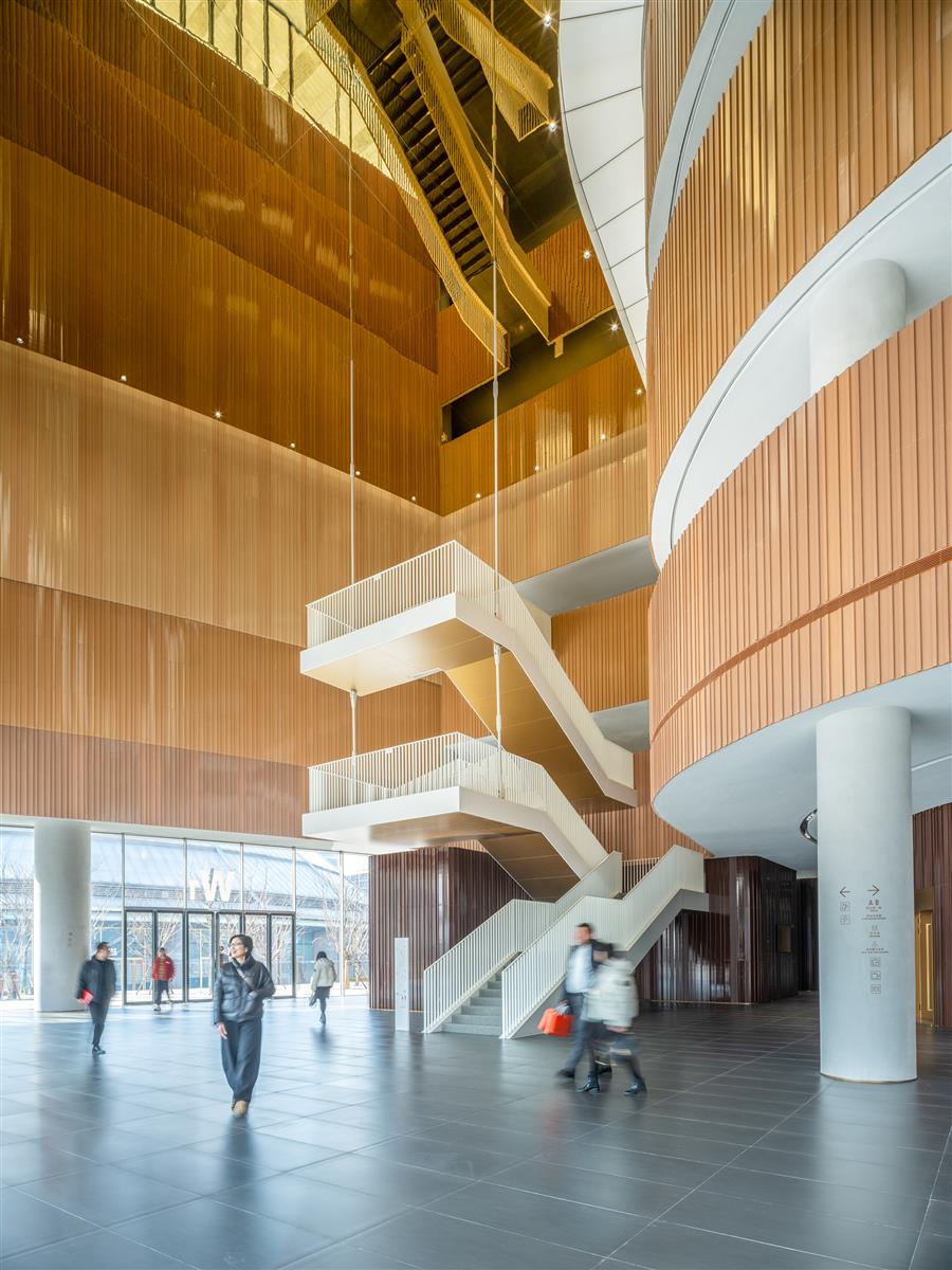 新劇院與毗鄰的西岸穹頂藝術(shù)中心,一座由SHL建筑事務(wù)所進(jìn)行更新改造再利用的歷史建筑,形成“陰陽”互補(bǔ)。穹頂藝術(shù)中心呈半透明狀,夜晚發(fā)散出朦朧的光芒,而大劇院的龐大體量則呈現(xiàn)出雕塑式的抽象美感。穹頂藝術(shù)中心曾是中國最大水泥廠的主要生產(chǎn)設(shè)施;新劇院以混凝土材質(zhì)的當(dāng)代演繹致敬這一工業(yè)遺產(chǎn)。由GFRC(玻璃纖維增強(qiáng)混凝土)面板覆蓋的建筑表皮,呈現(xiàn)多變的水平條紋,表達(dá)了黃浦江江水持續(xù)流動的形態(tài)。