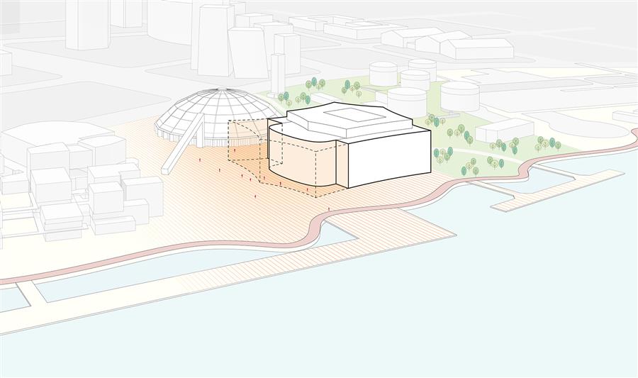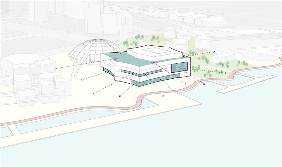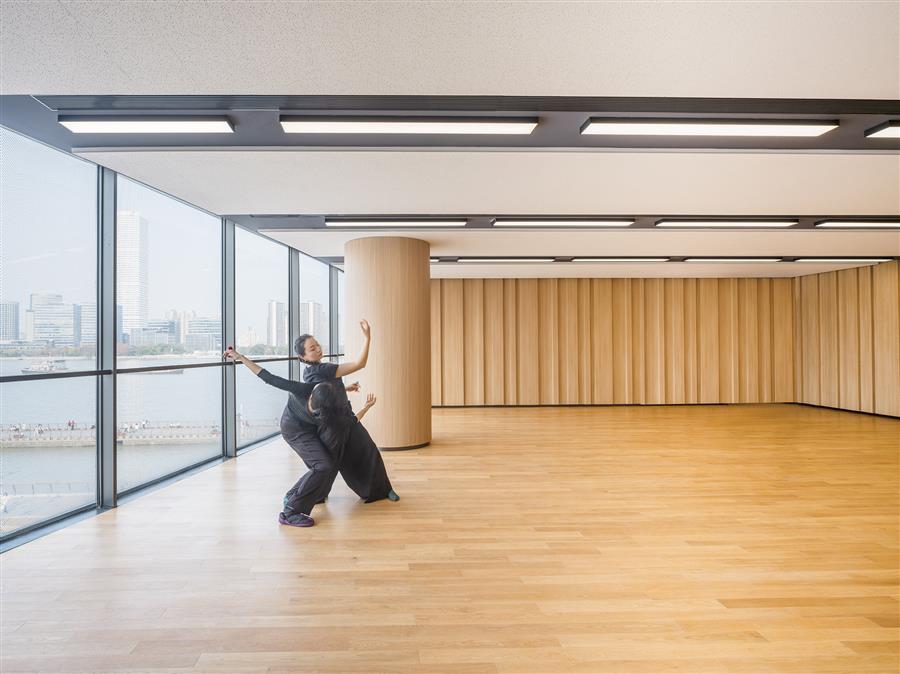 擁有大劇場和黑盒小劇場的西岸大劇院將對標(biāo)世界級的演藝中心,它不僅提供卓越的聲學(xué)以及觀演體驗,還通過室外的大型公共廣場來強(qiáng)調(diào)公共屬性。在室內(nèi)的公共空間中,人們可以透過巨大的玻璃幕墻欣賞黃浦江景和西岸風(fēng)光。寬敞的露臺——一處位于屋頂,另一處位于中間樓層——為觀眾在演出間隙提供戶外休憩的場所,享受濱水景觀和壯麗的城市天際線。